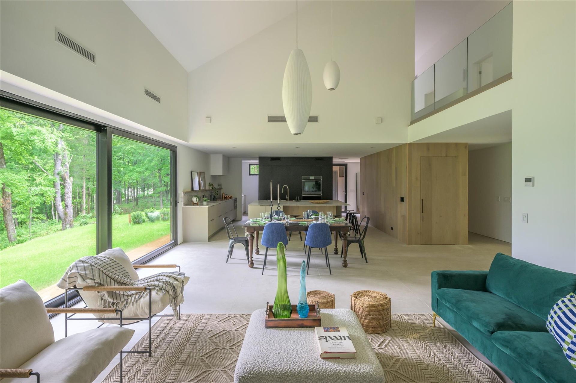 The thoughtfully open floor plan eliminates closed hallways, favoring a dynamic spatial rhythm. Sliding doors offer flexibility, privacy, and uninterrupted view corridors. Upstairs, a gallery-style walkway connects the private zones, overlooking the main living area below.