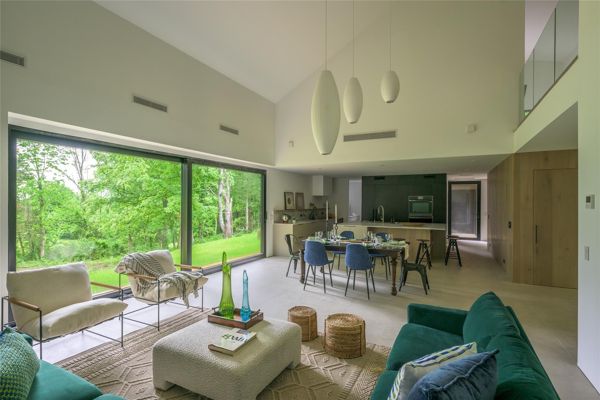- Living room with high vaulted ceiling