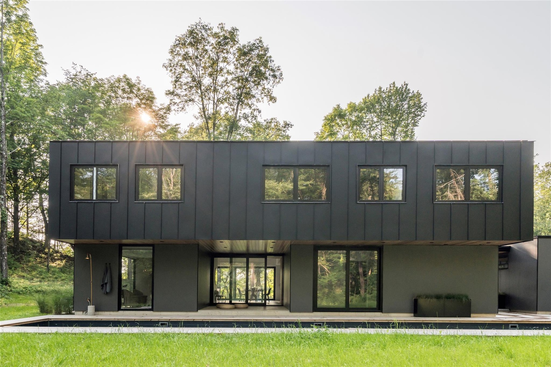 From the moment you step through the breezeway entry, you are met with a fluid transition between interior and exterior. Protected outdoor living spaces—including a covered patio, poolside walkway, and a second-floor roof balcony—invite year-round enjoyment. Massive window placements frame sweeping views of the site and the distant Catskill Mountains, inviting nature inward and blurring the boundaries between inside and out.