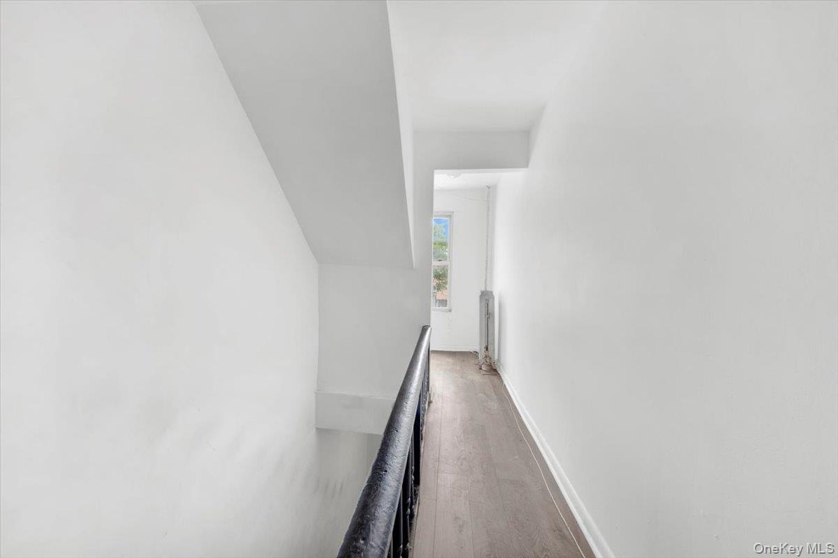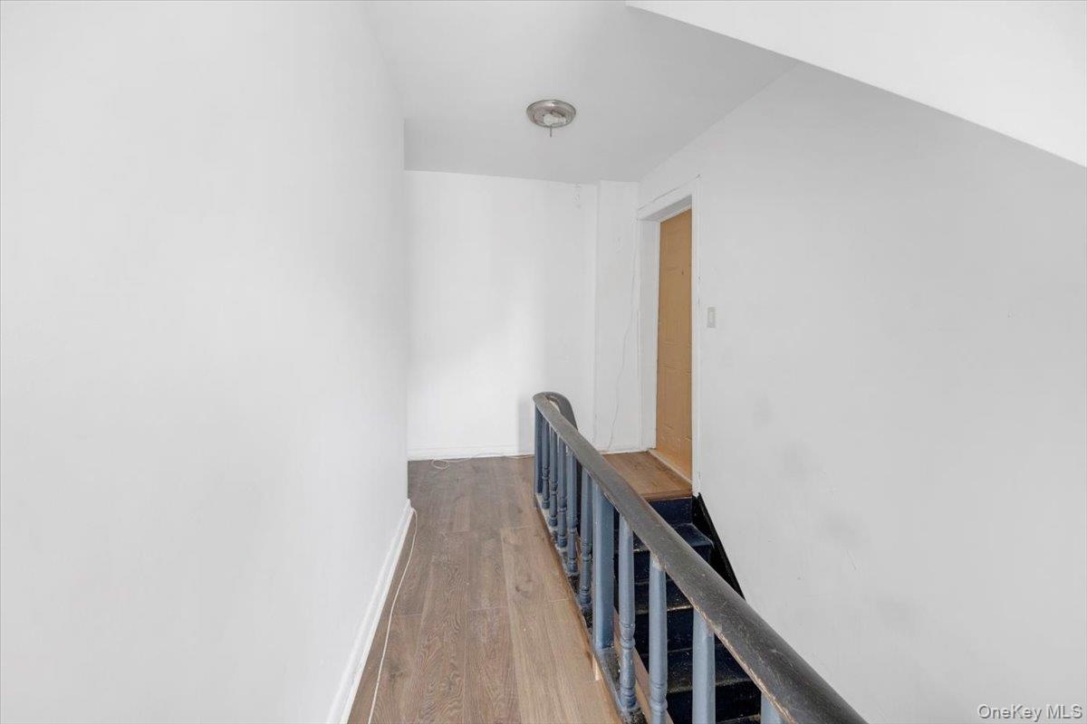 - Corridor with an upstairs landing, wood finished floors, and baseboards