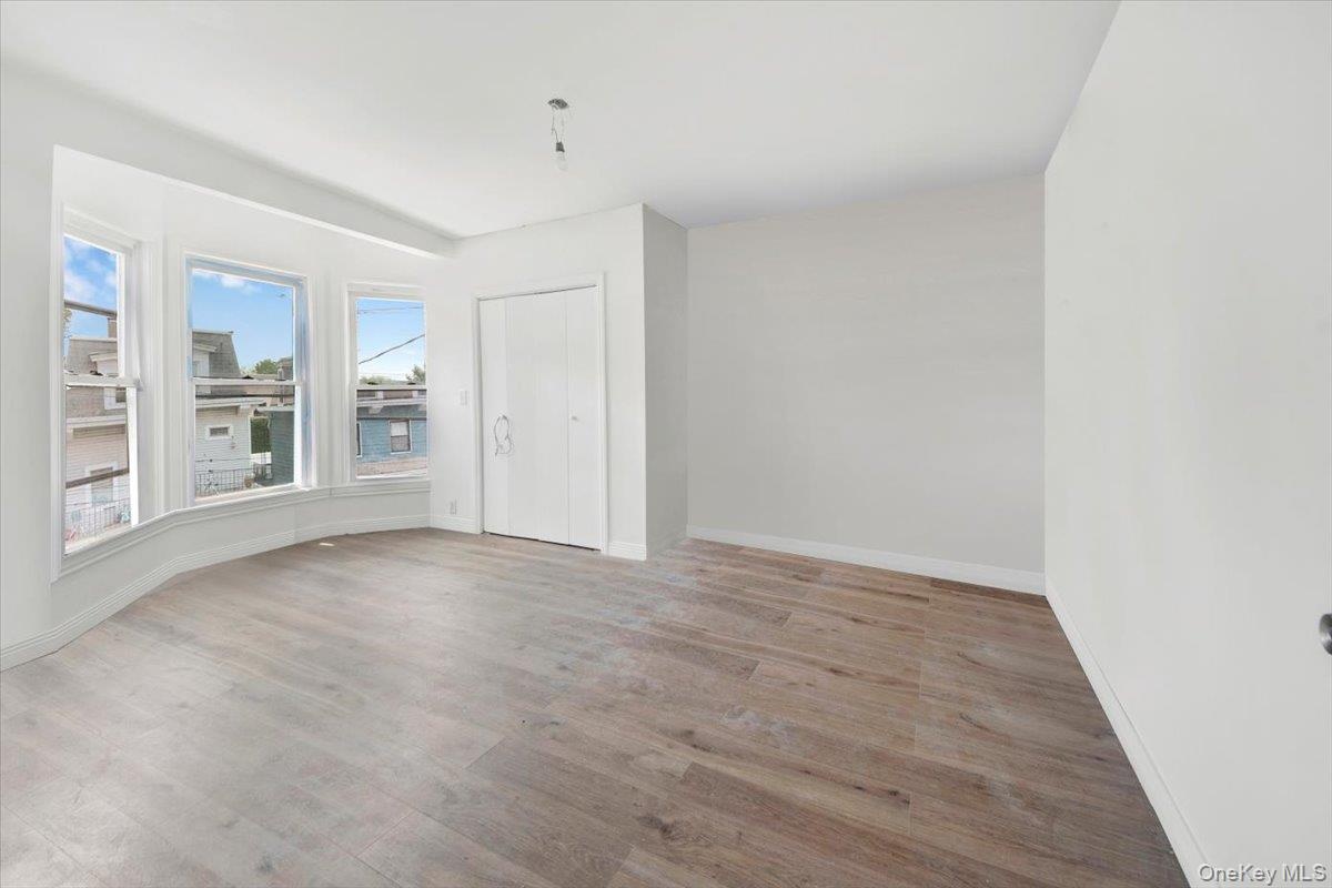 - Unfurnished room featuring wood finished floors, plenty of natural light, and baseboards