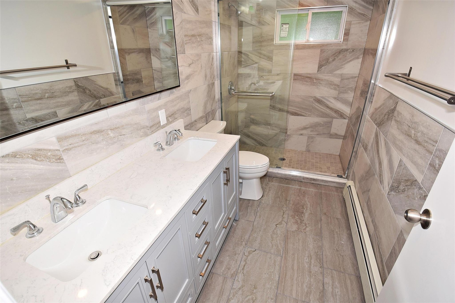- Bathroom with baseboard heating, toilet, double vanity, a shower stall, and tile walls