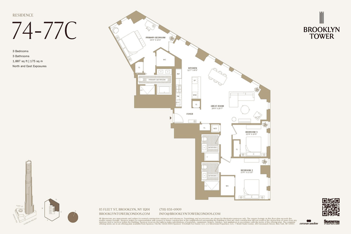 Brooklyn Tower takes inspiration from the ornate Dime Savings Bank at its base, lifting the historic building's geometric form to pierce the sky in a dazzling new way. Condominium residences begin at over 575 feet in the air, delivering the highest residences for sale in Brooklyn. Located at 85 Fleet Street in the heart of Downtown Brooklyn and situated at the crossroads of thriving neighborhoods including Ft. Greene, Cobble Hill, Boerum Hill and Brooklyn Heights, Brooklyn Tower offers 143 studio to four-bedroom full-service luxury condominium residences, some with private outdoor terraces.