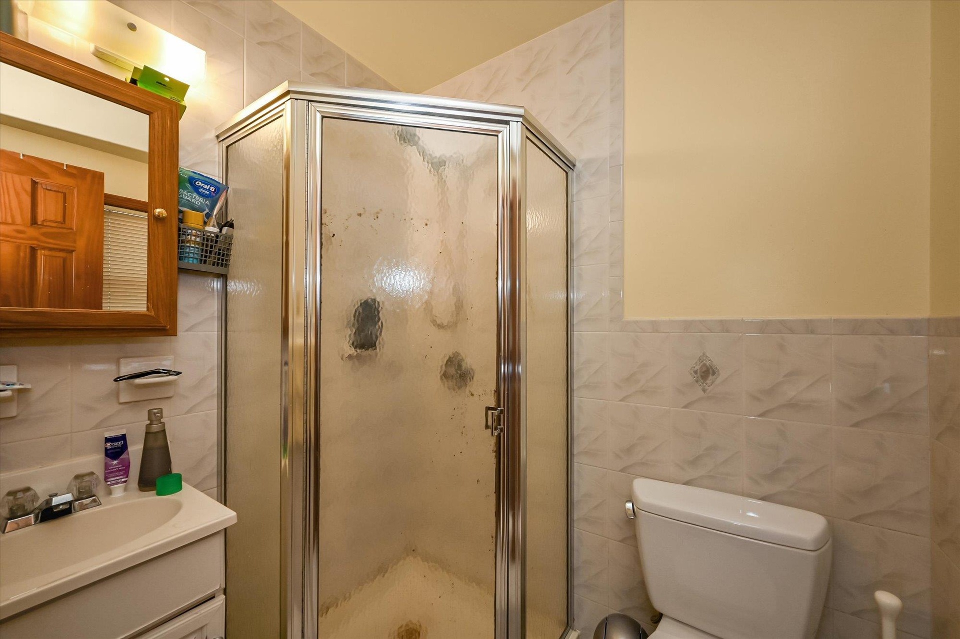 - Full bath featuring tile walls, vanity, toilet, and a stall shower