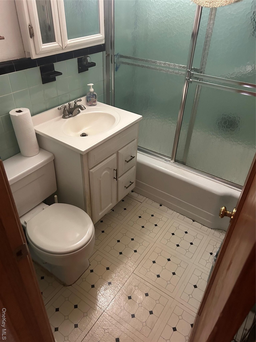 - Bathroom featuring toilet, vanity, enclosed tub / shower combo, and tile walls