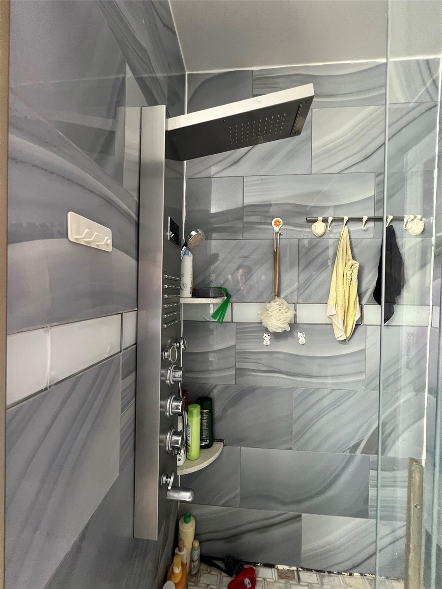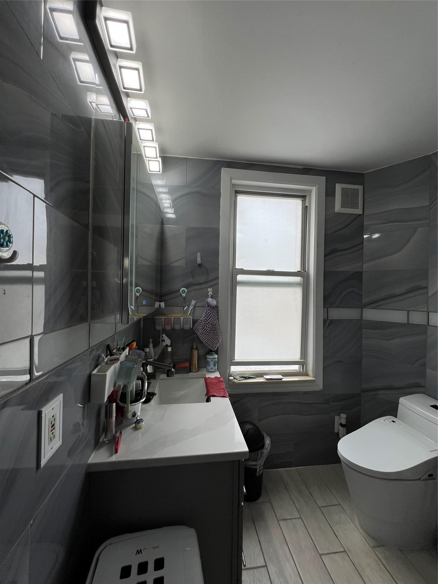 - Full bath with tile walls, toilet, a shower stall, and vanity