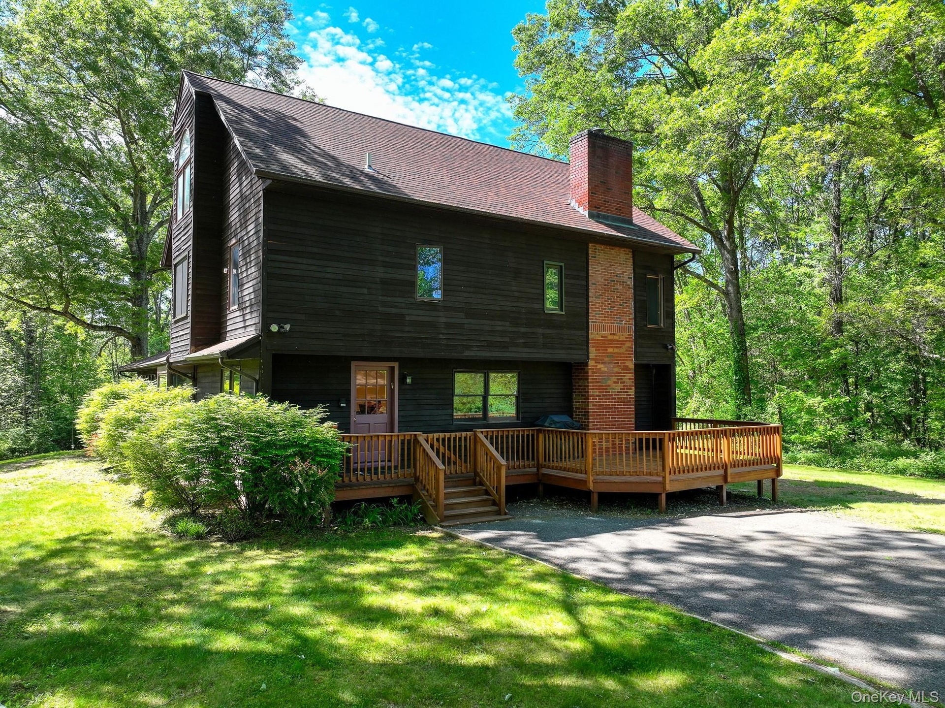 - View of front of house featuring a chimney, a front yard, and a wooden deck