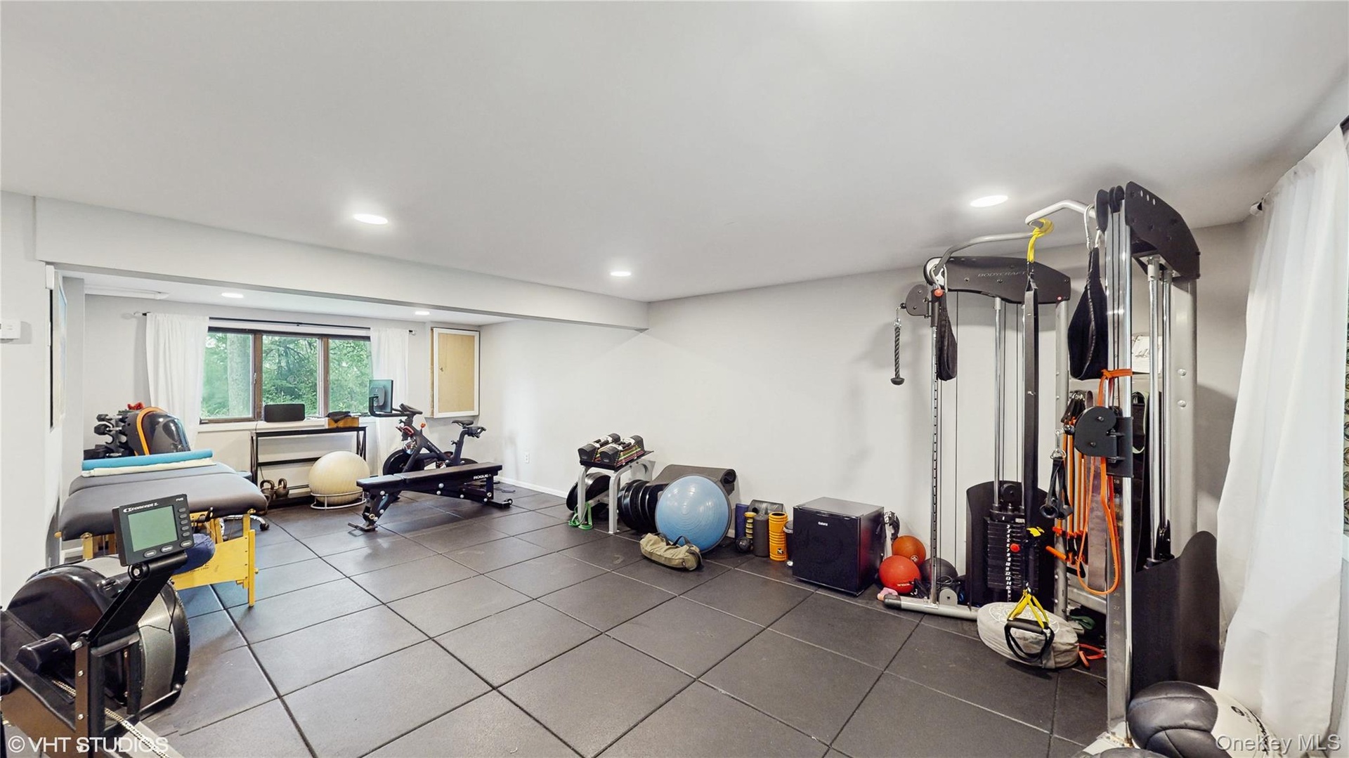 - Mezzanine with wood work ceiling, recessed lights and forest view