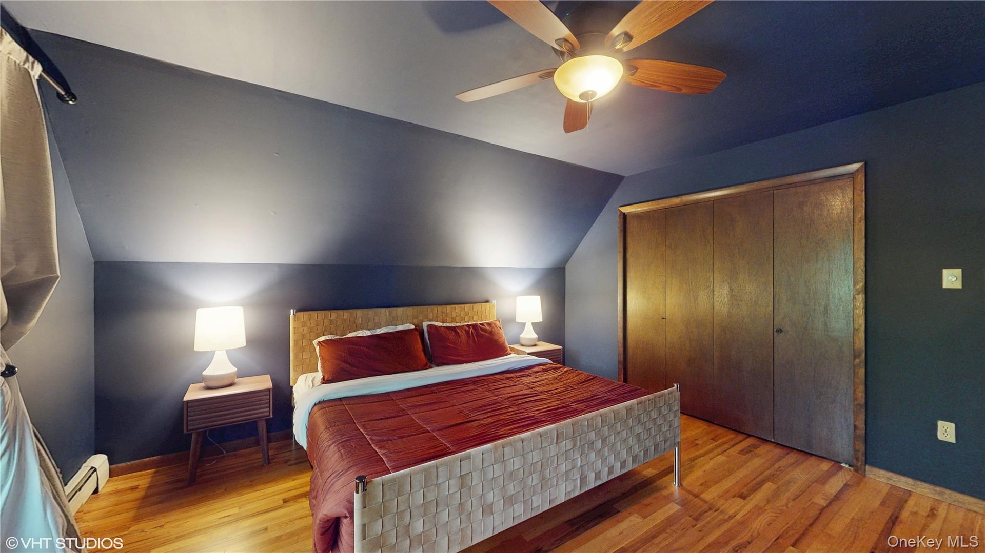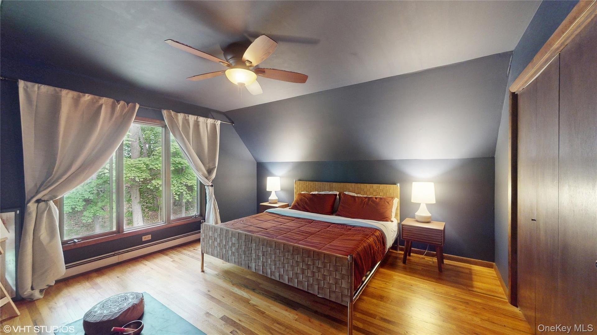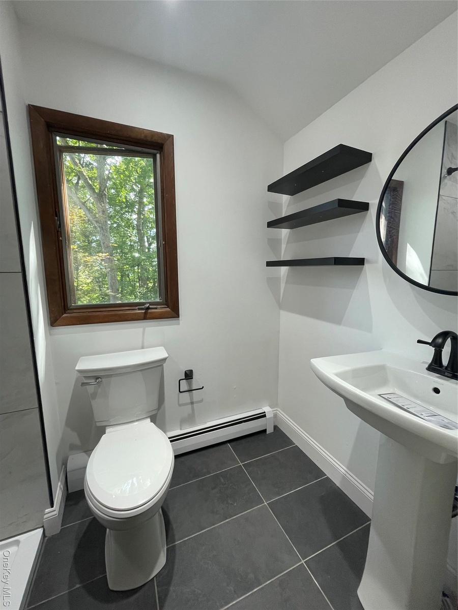 - Half bathroom with a baseboard radiator, dark tile patterned flooring, and vaulted ceiling