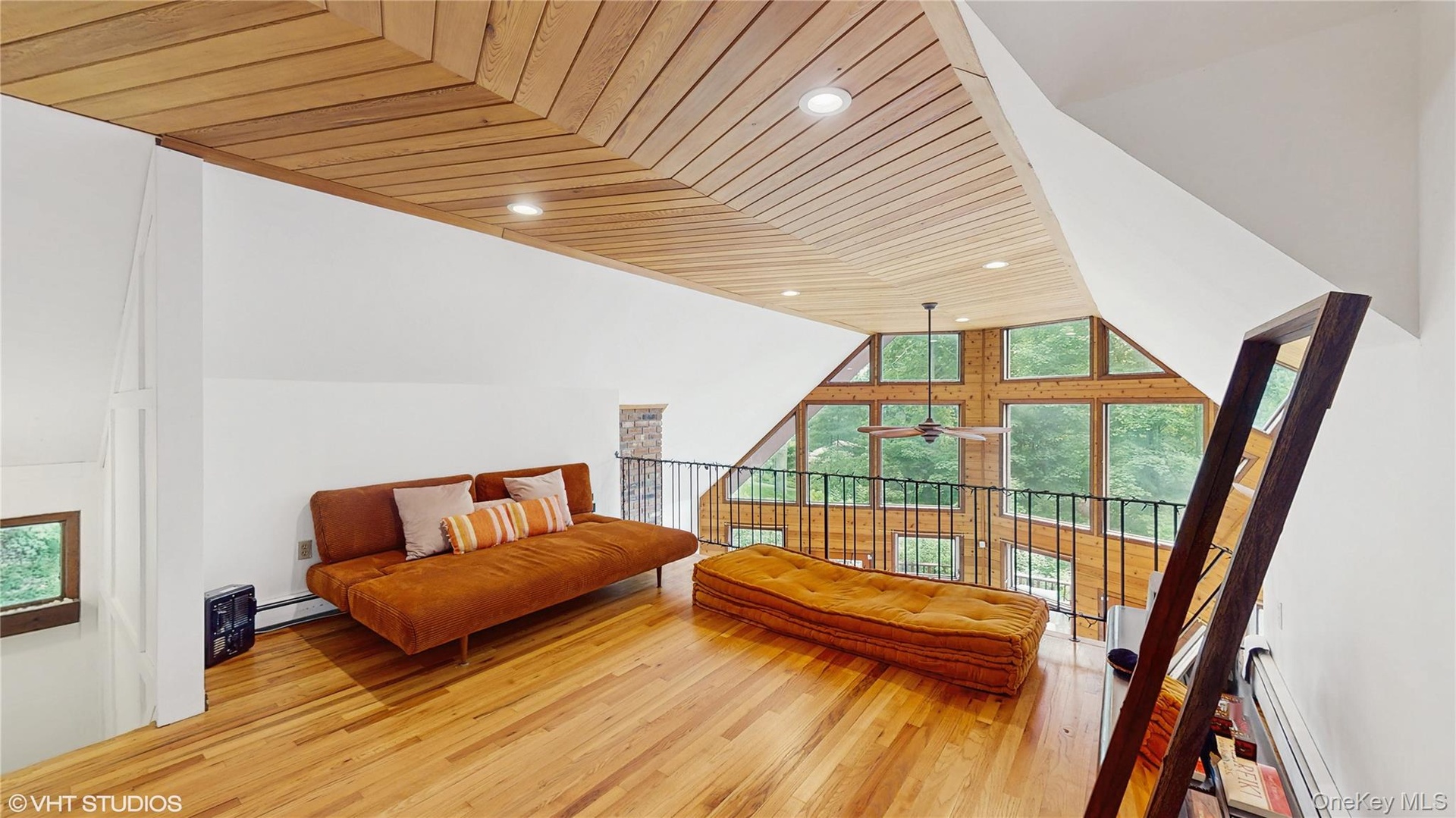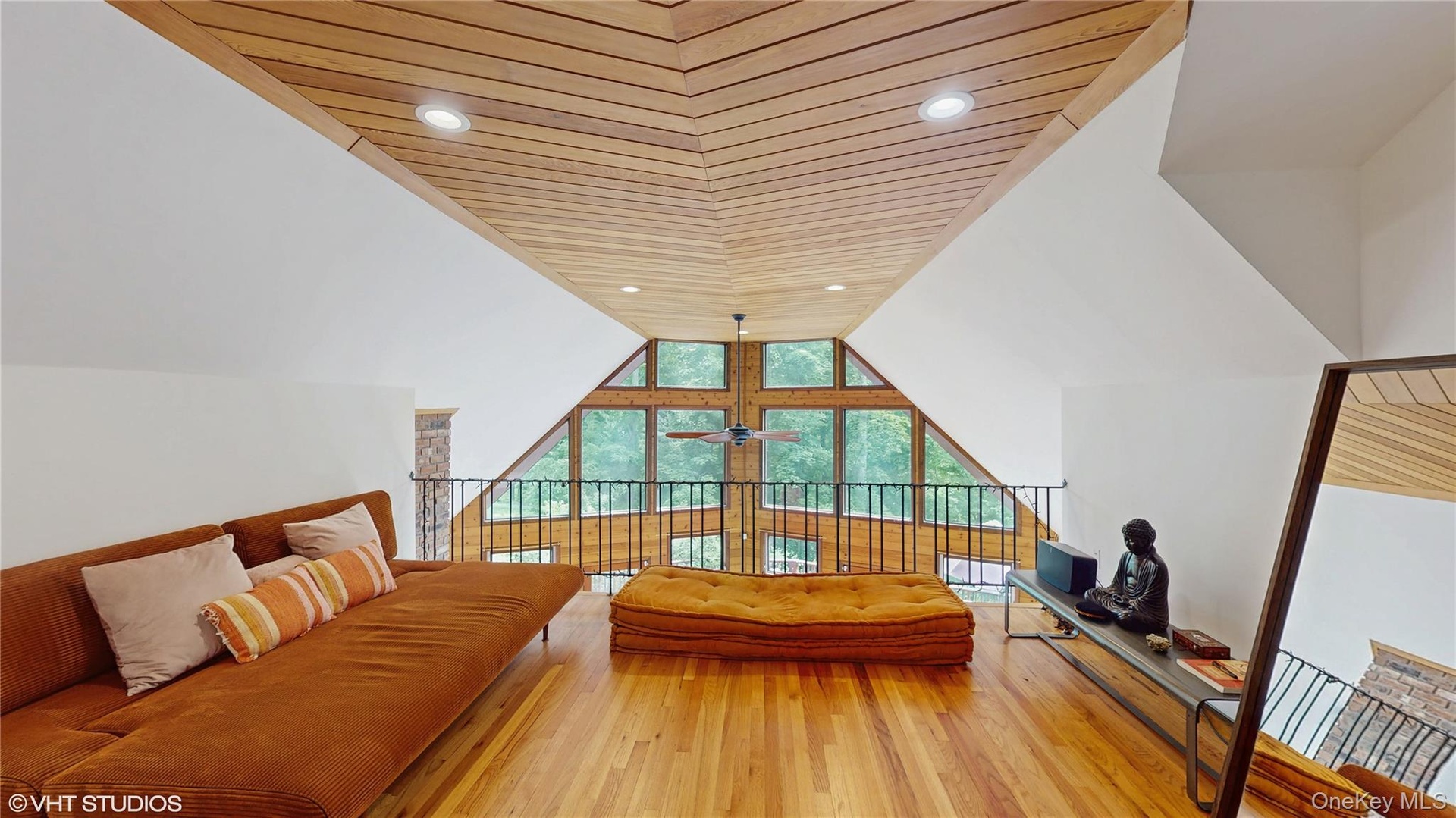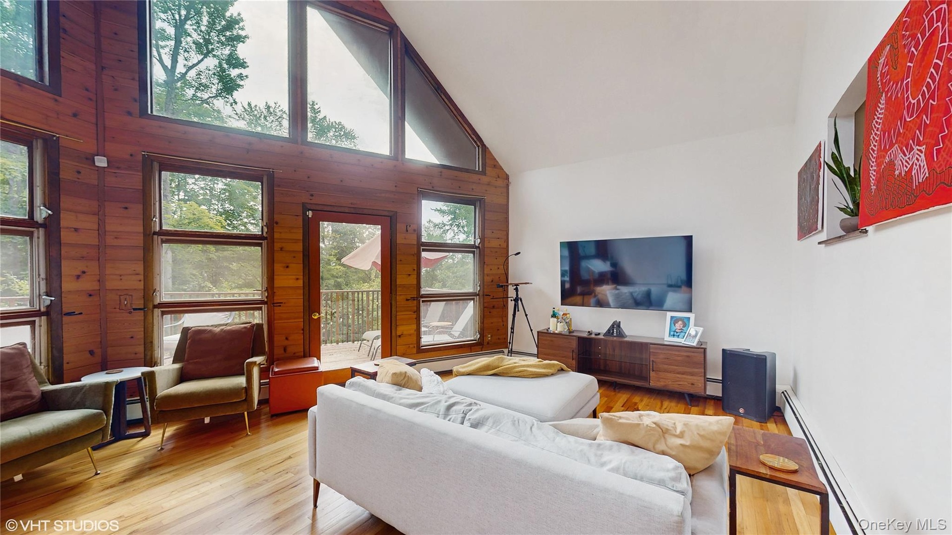 - Living area with healthy amount of natural light, wood details, wood floors, high vaulted ceiling