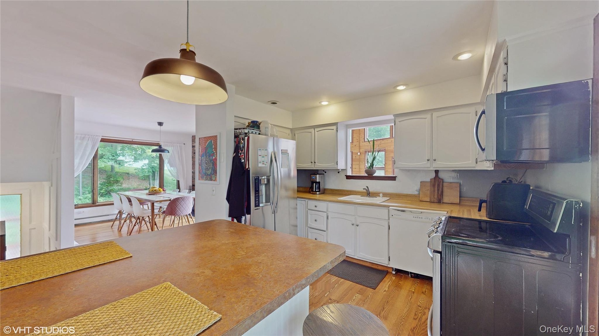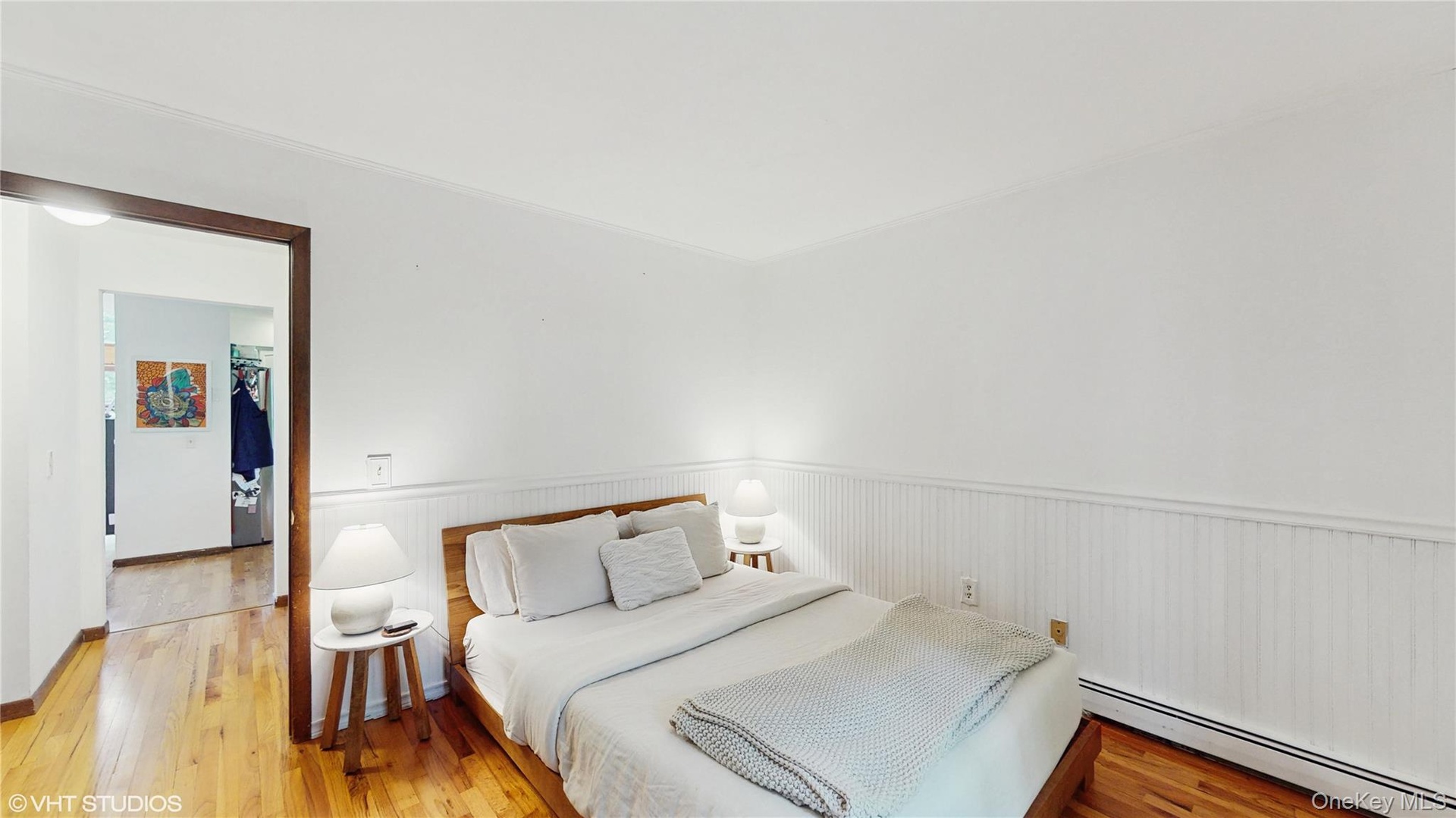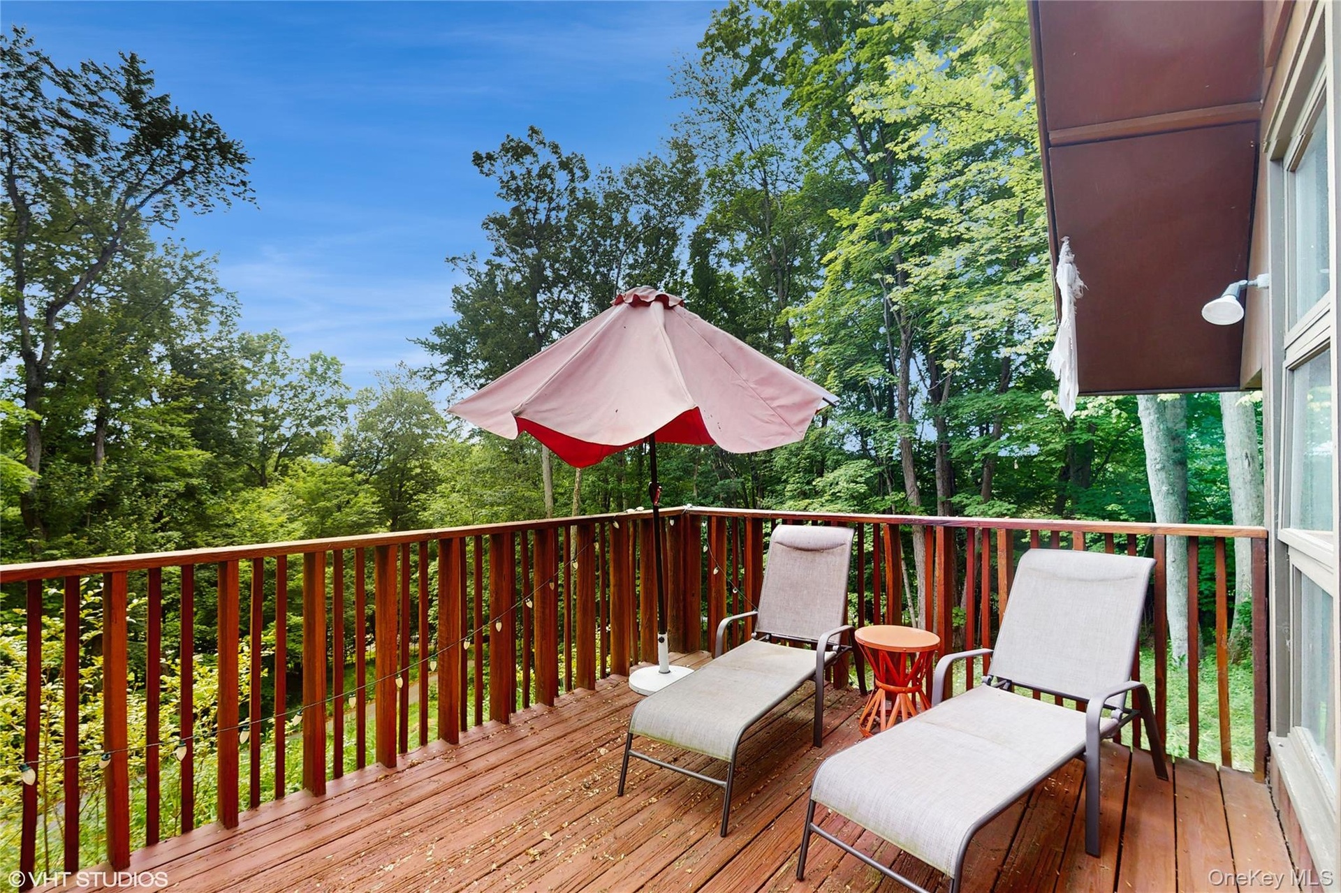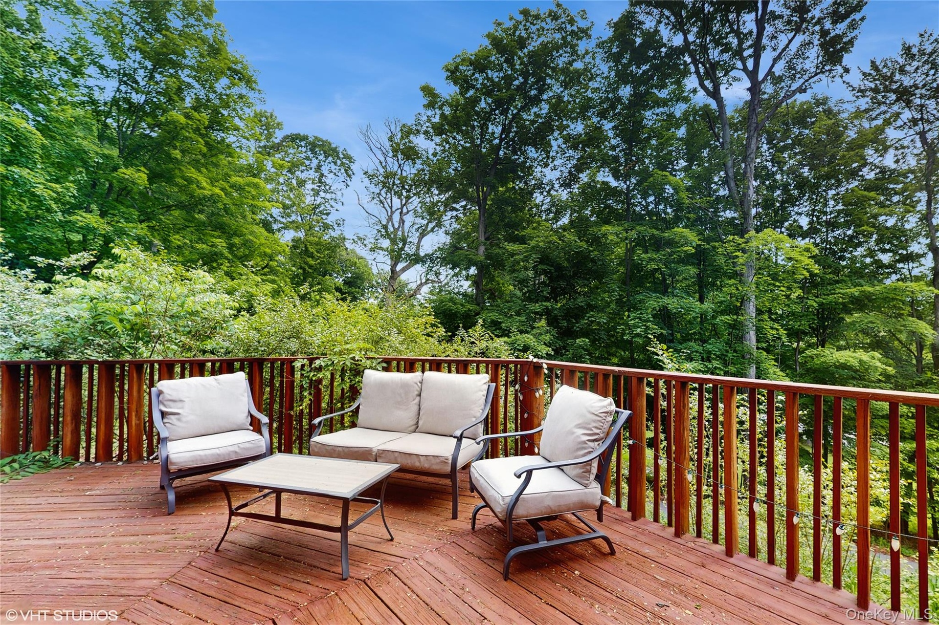 The first floor also features an eat in kitchen with stainless steel appliances; two great bedrooms both with generous closet space and a newly renovated main bathroom. Head upstairs to the mezzanine which overlooks the living room and provides a direct view to the lush woods. Whether used as home-office, art studio, family room or meditation space this added feature will take your breath away with its airiness and original woodwork detailed ceiling. The mezzanine area seamlessly flows into the very private, suite-like primary bedroom with its own en-suite renovated full bathroom. Two closets, picture window with more forest views and hallway storage further elevate this living area. The lower level is finished space that can serve multiple functions. It has storage room and utilities area; laundry room and a 1 car garage with entry into the house - plus 2 additional parking spaces. Close to major highways, shopping, Metro North, country clubs in a highly sought neighborhood.