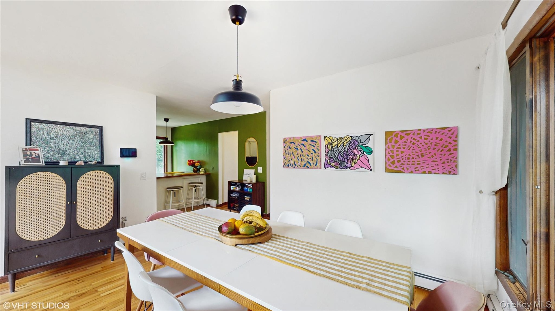 - Dining room with chandelier, hardwood floors, a brick fireplace,
