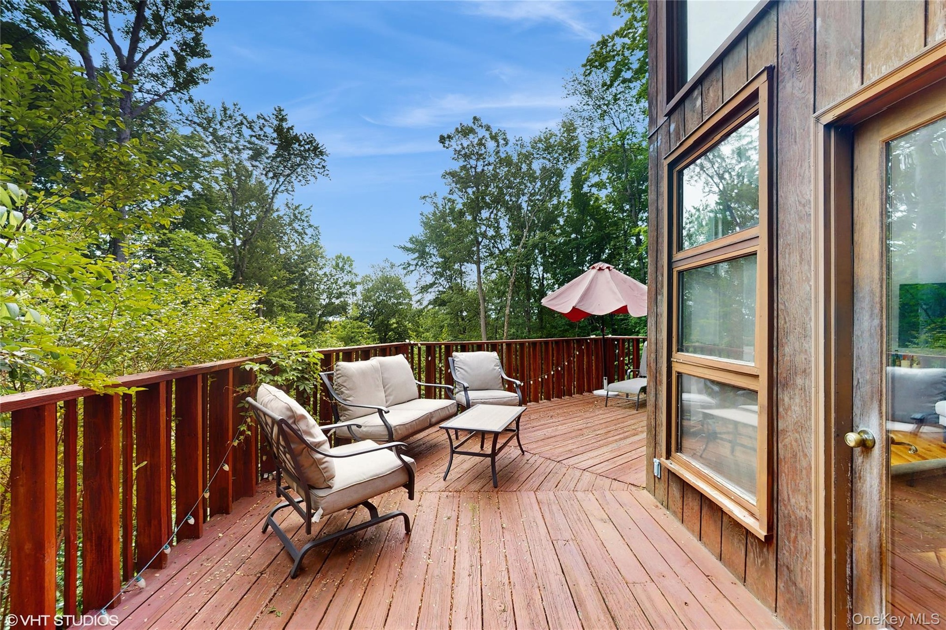 - Mezzanine with wood work ceiling and recessed lighting, forest views