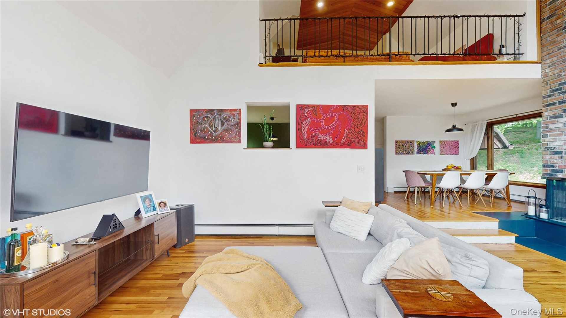 - Living room with high vaulted ceiling, light wood-style flooring, and mezzanine above