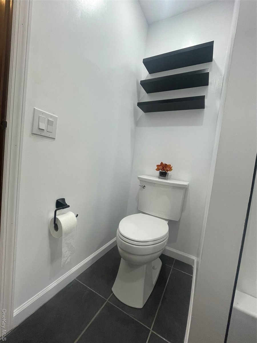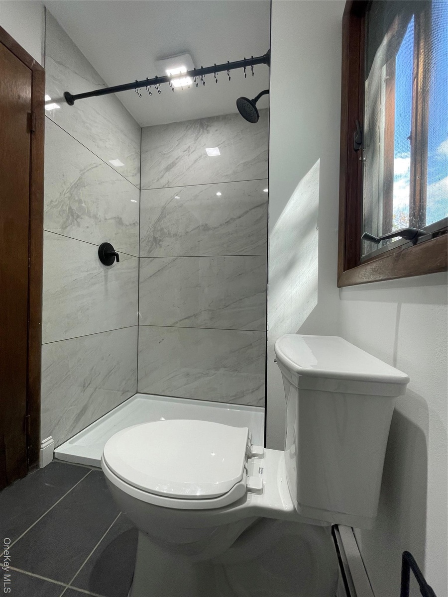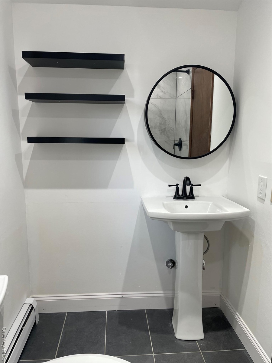 - Half bathroom featuring a baseboard radiator and dark tile patterned floors