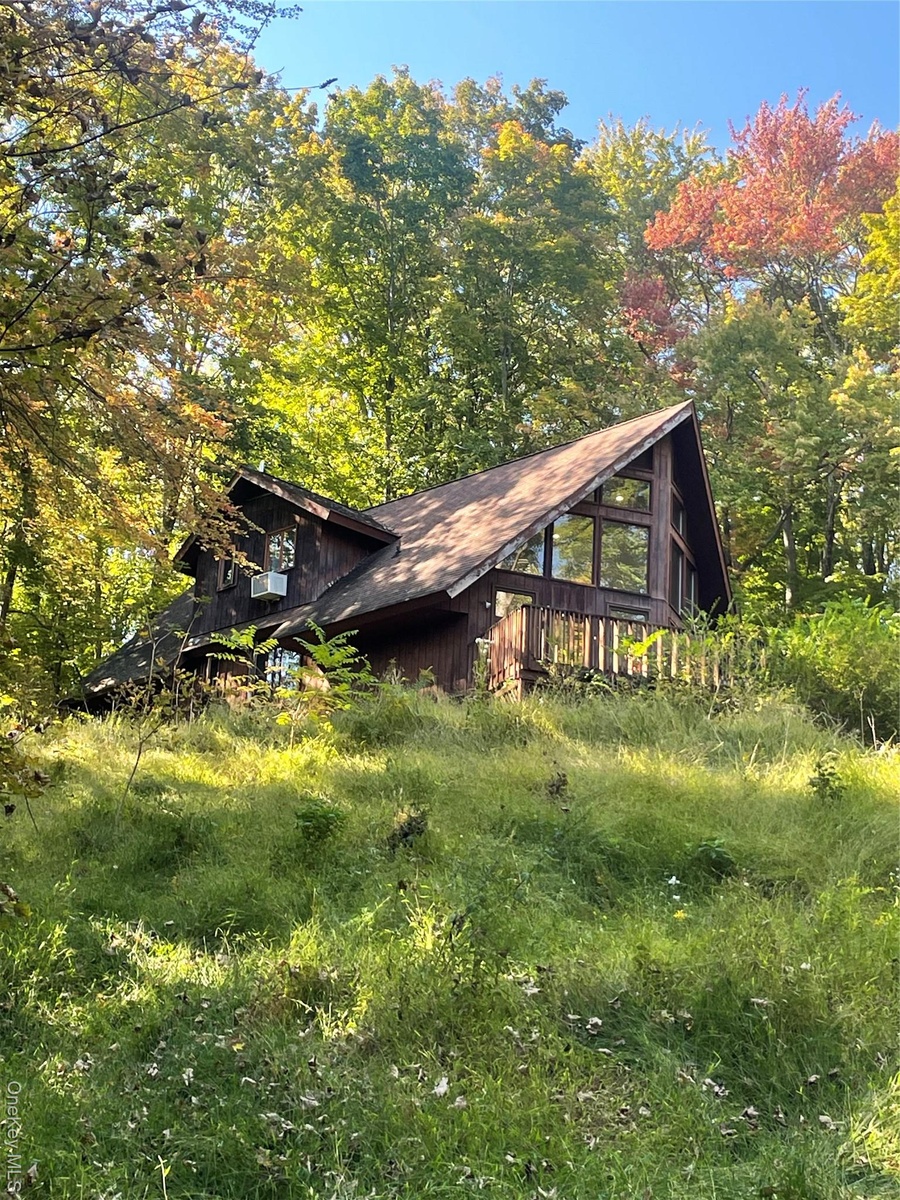 Rare and unique 3 bedroom, 2 bath, chalet-style property on 1.2 acres of mature, wooded land, perfect for those seeking privacy while maintaining closeness to city life. House has an open layout with living and dining areas featuring a 3-sided wood burning brick fireplace; dramatic 2 story tall walls of windows connect nature to the contemporary living space year-round. The living room opens to generously sized, semi-wrap around deck, perfect for morning air and watching the sunrise or unwinding at sunset at the end of your day.