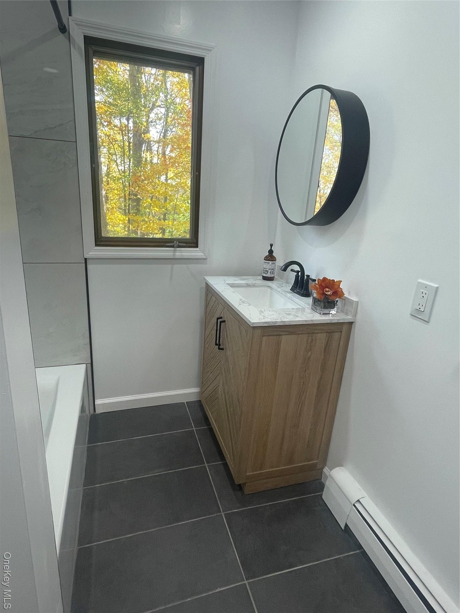 - Full bath with baseboard heating, vanity, dark tile patterned flooring, and a tub to relax in