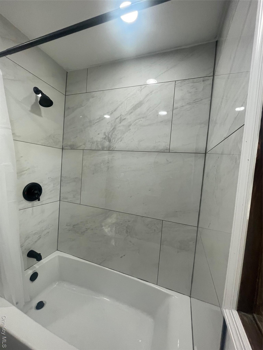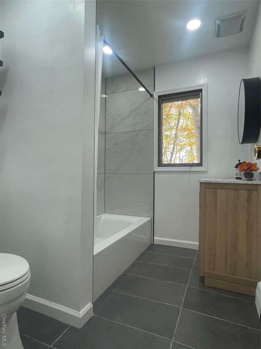 - Bathroom with vanity, tub / shower combination, and dark tile patterned floors