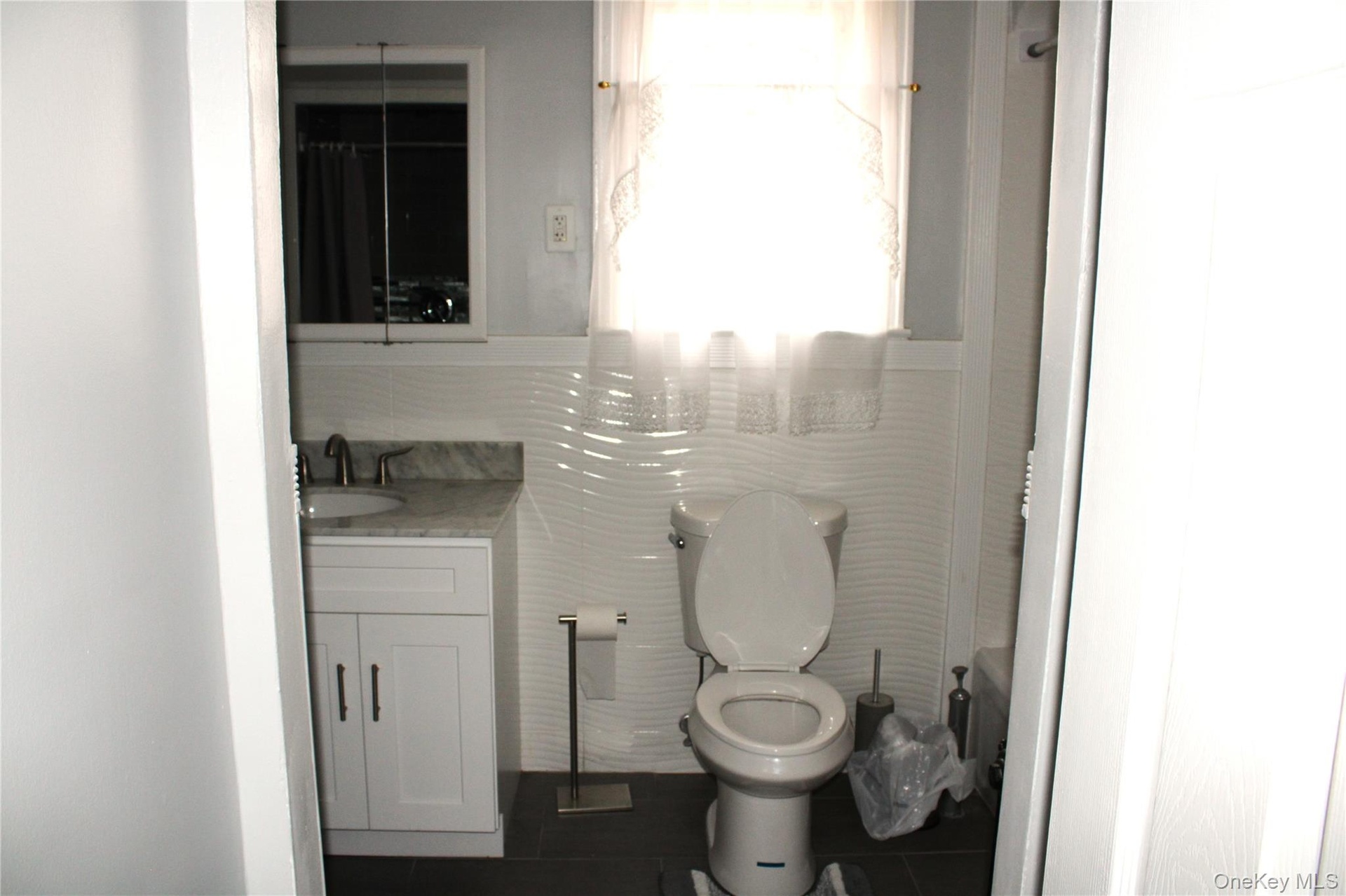 - Bathroom featuring vanity, toilet, and tile patterned floors