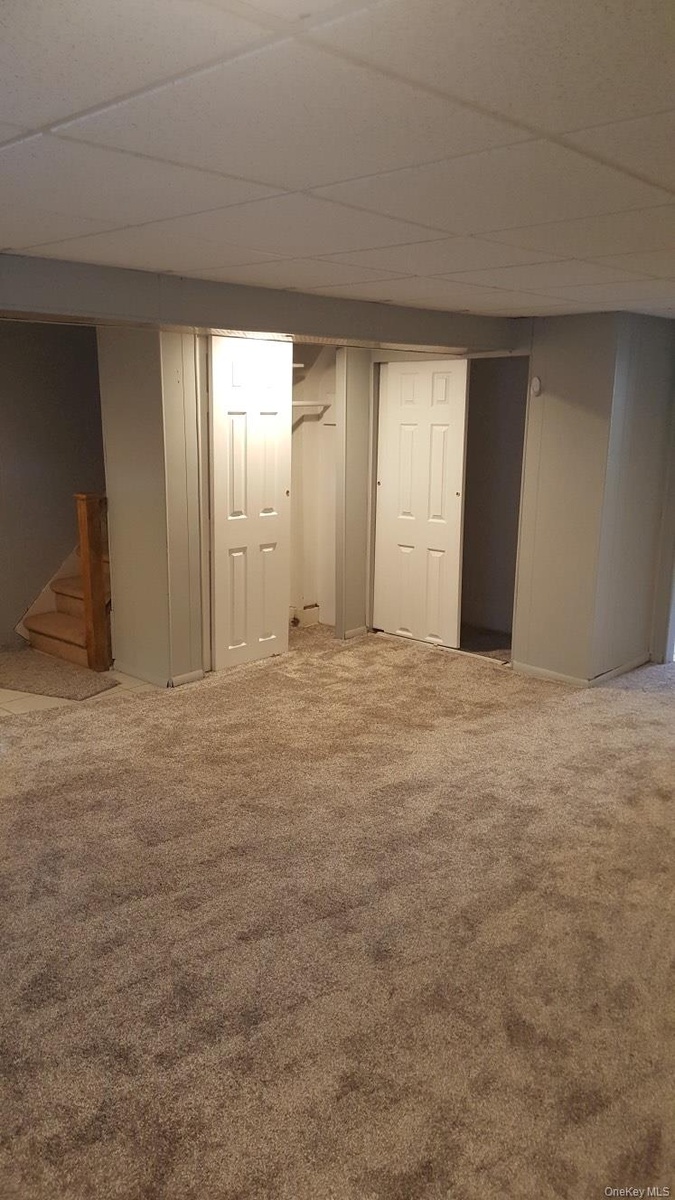 - Finished basement featuring carpet floors, a drop ceiling, and stairway