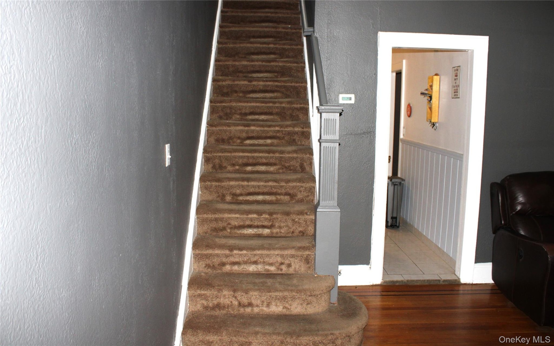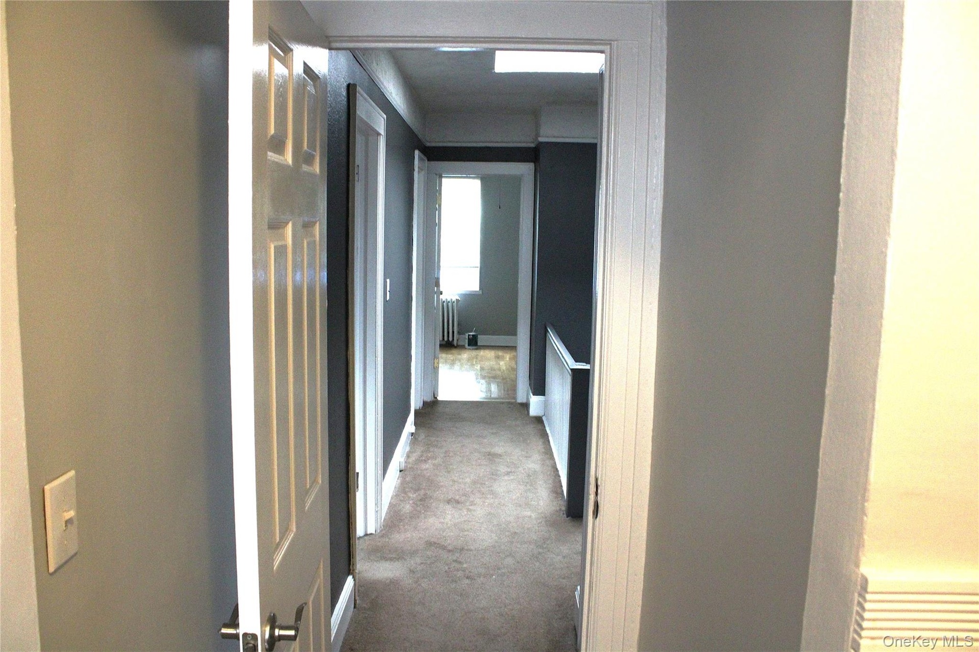 - Corridor with an upstairs landing, carpet flooring, baseboards, and radiator heating unit