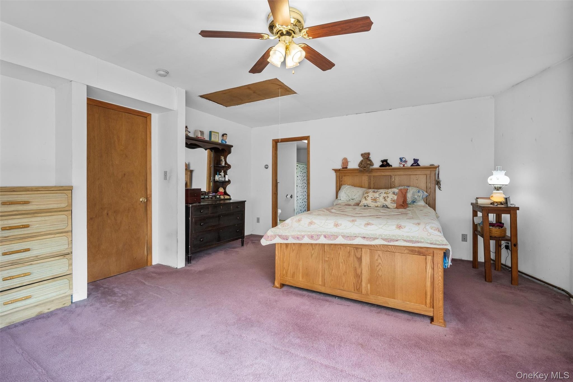 - Bedroom featuring light carpet, attic access, and a ceiling fan