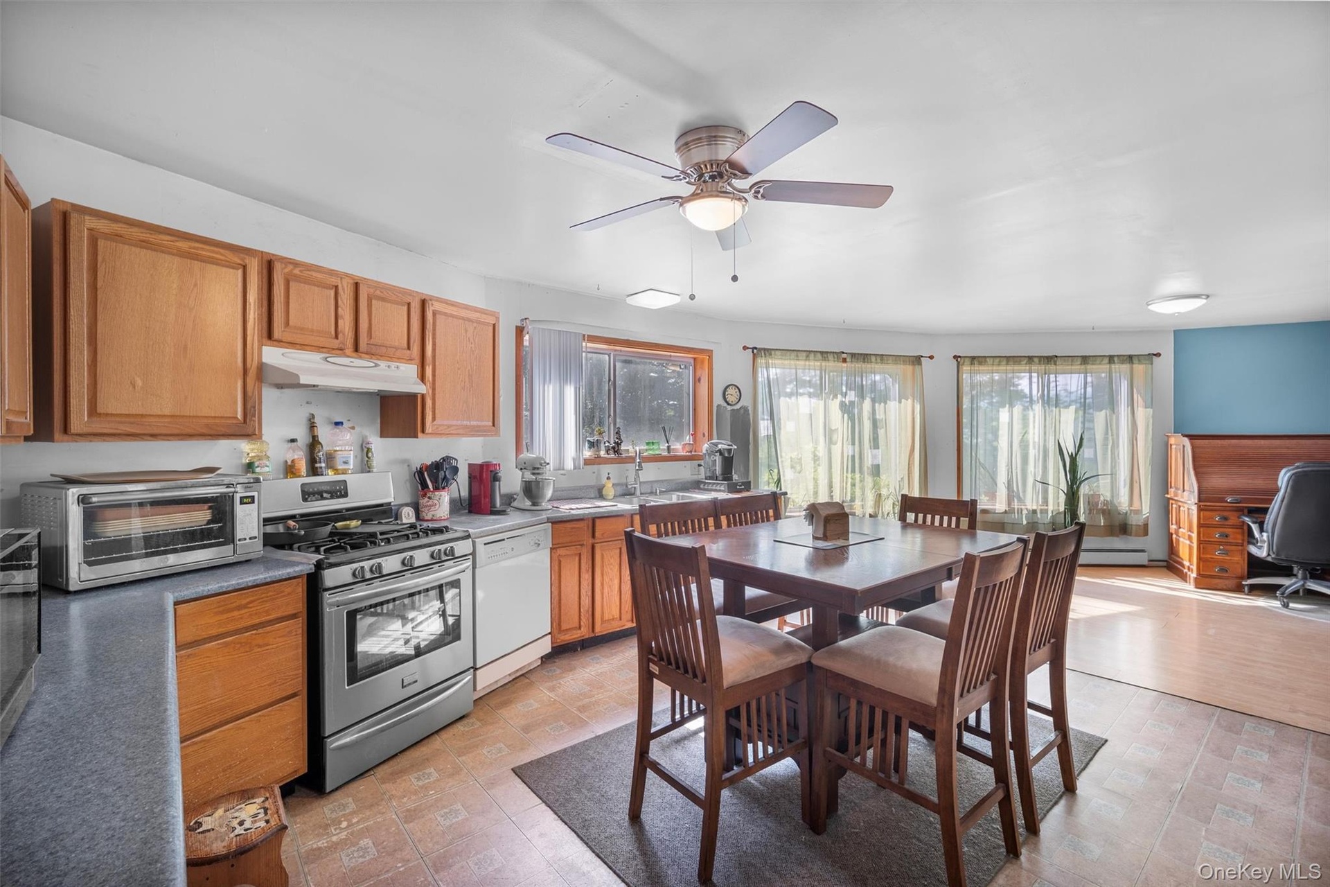 - Kitchen with stainless steel range with gas stovetop, dishwasher, under cabinet range hood, ceiling fan, and a baseboard radiator