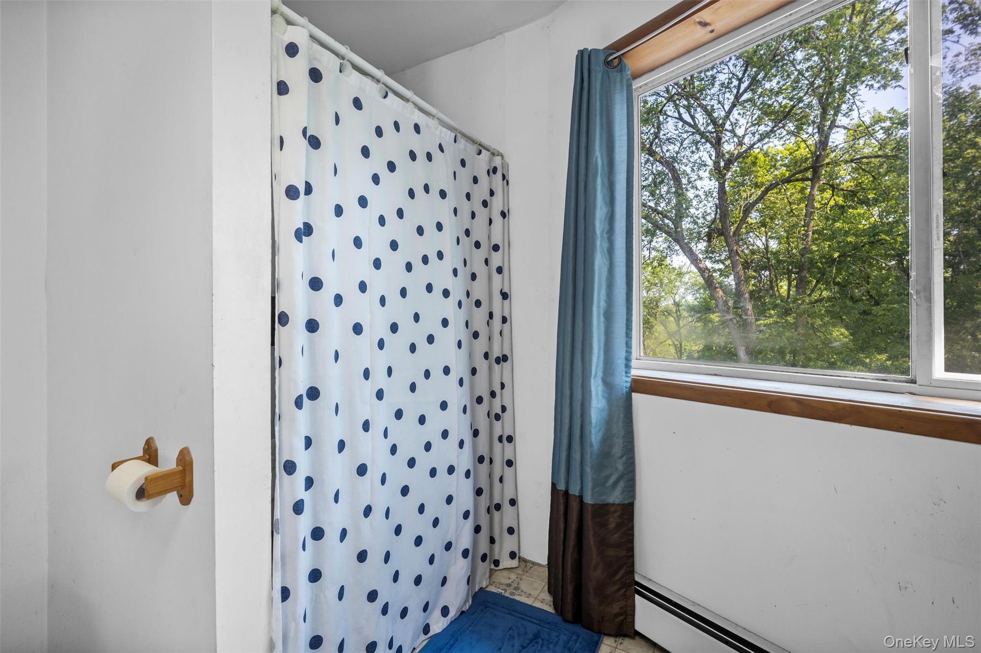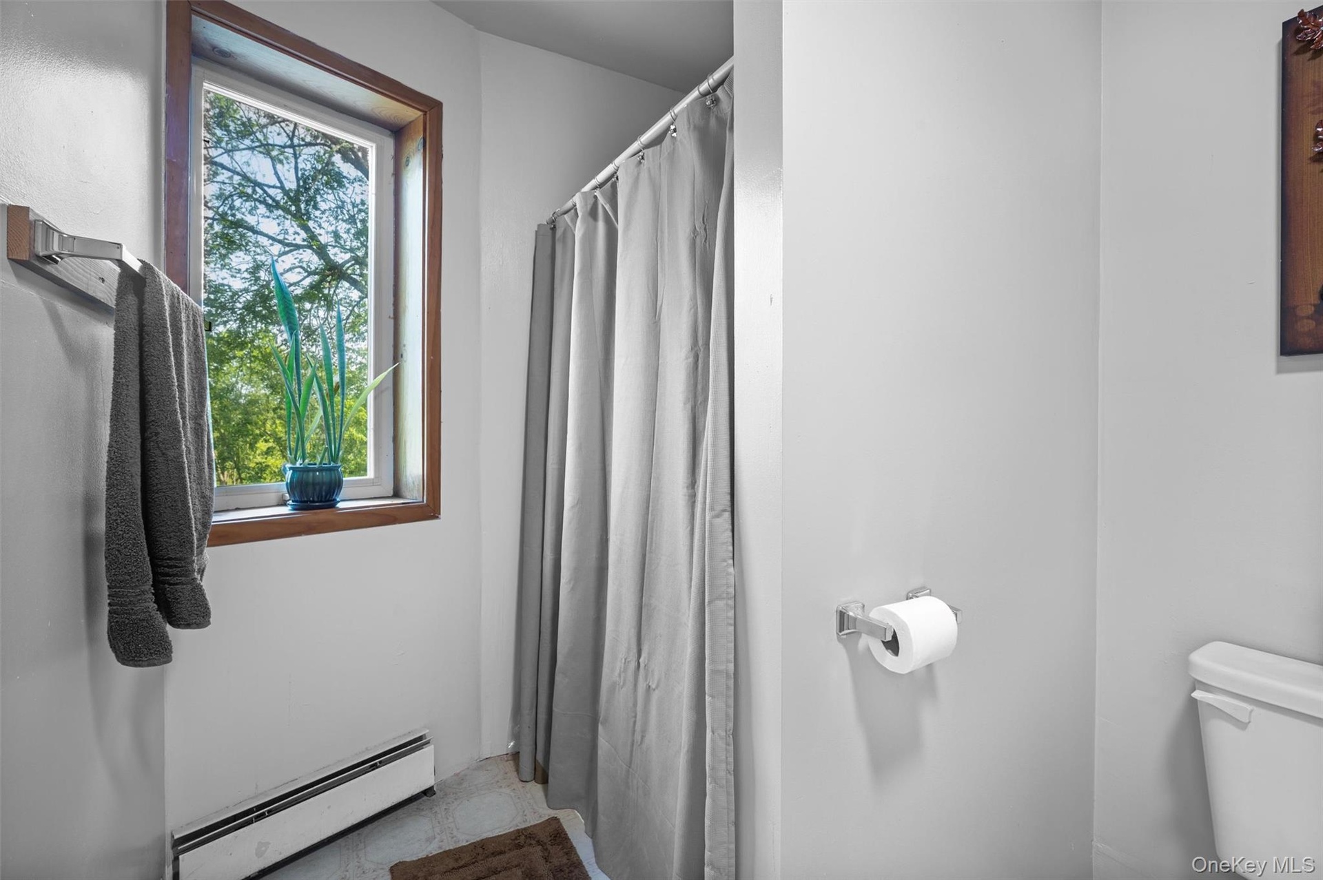 - Bathroom with a baseboard heating unit, toilet, and a shower with shower curtain