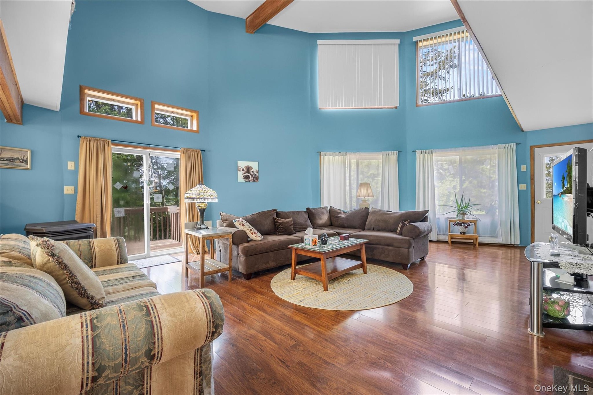 - Living area featuring a towering ceiling, wood finished floors, and beam ceiling