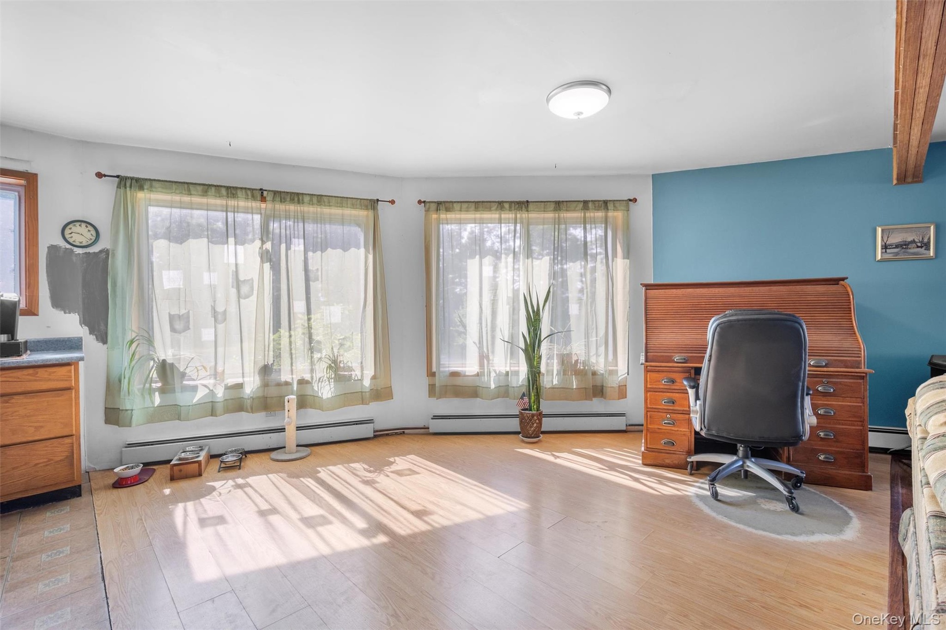 - Living area featuring stairway, wood finished floors, a towering ceiling, and a baseboard radiator