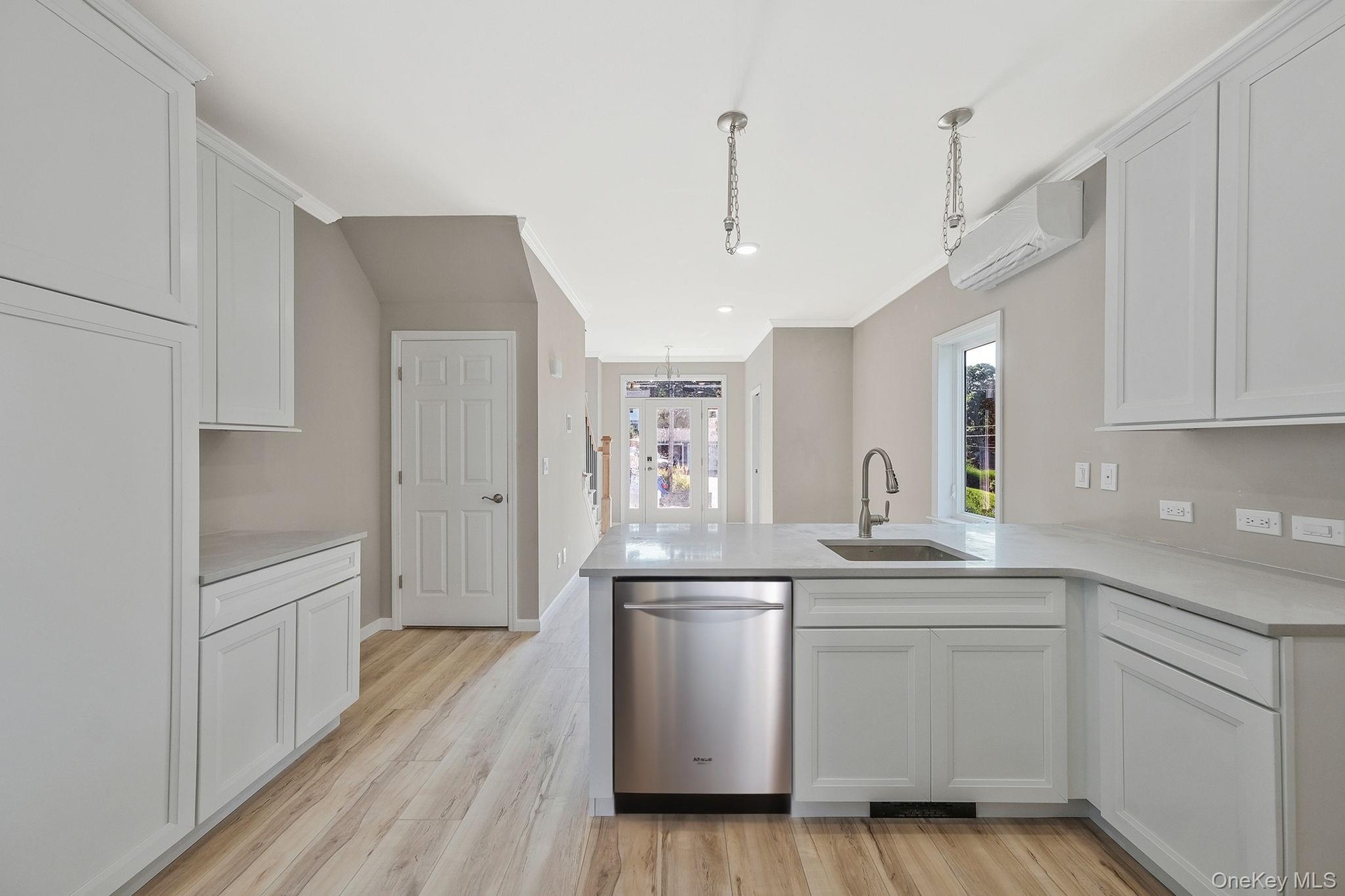 - Kitchen with stainless steel appliances, a peninsula, recessed lighting, a wall unit AC, and light wood finished floors