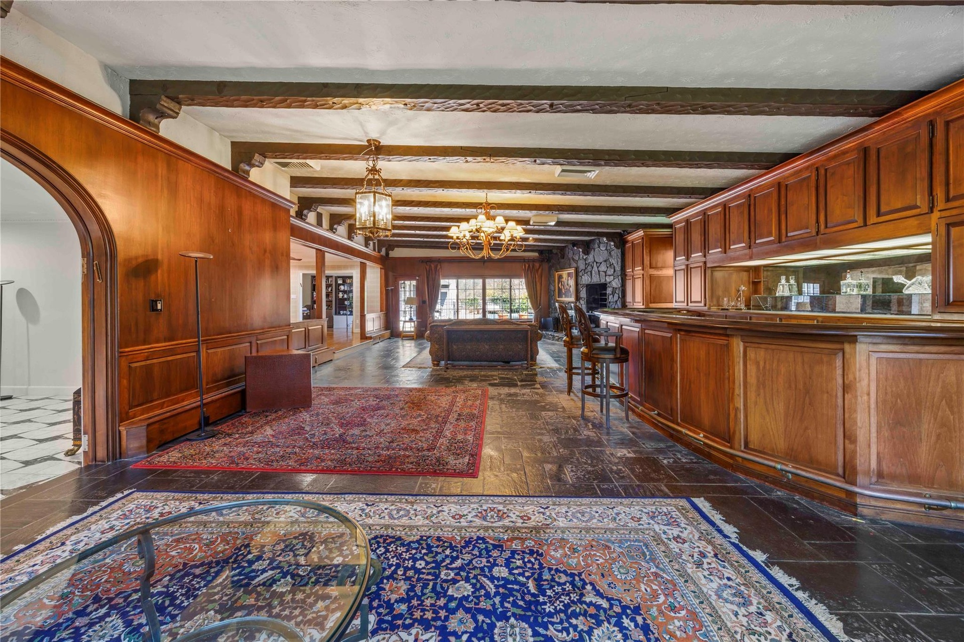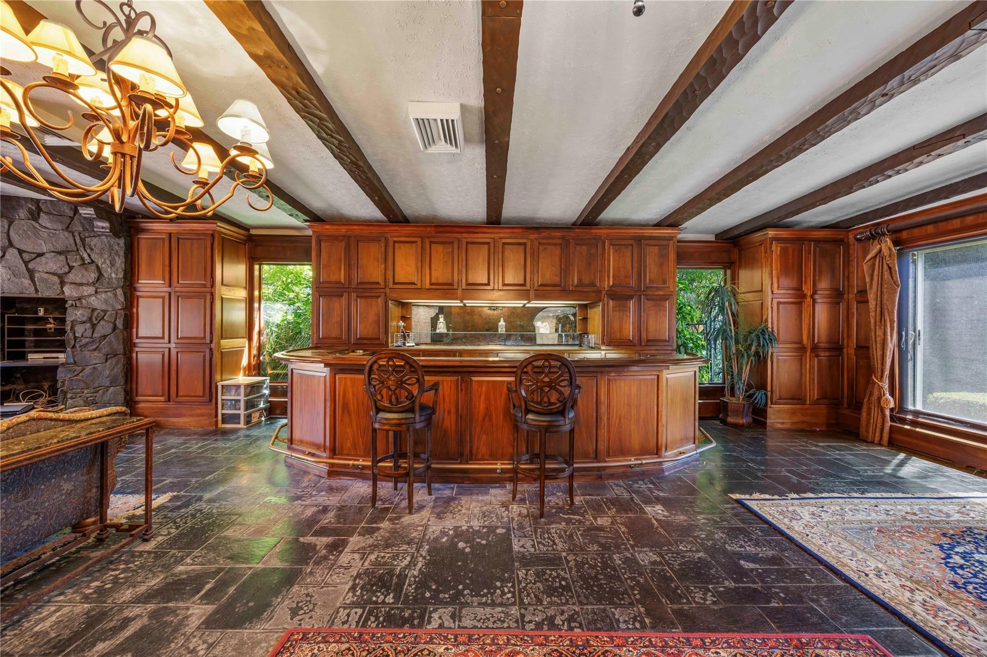 - Living room with a chandelier, beamed ceiling, stone tile floors, and a stone fireplace