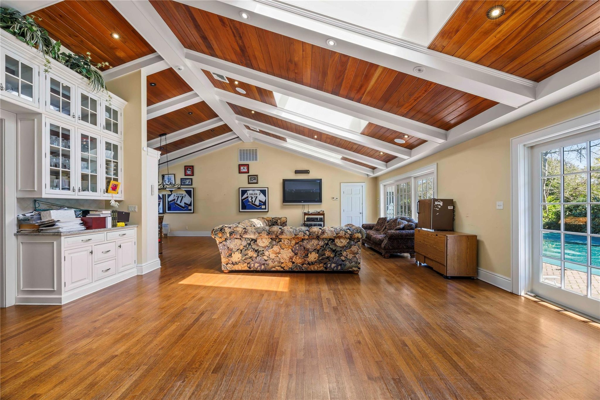 - Living area featuring wooden ceiling, wood finished floors, recessed lighting, a skylight, and baseboards