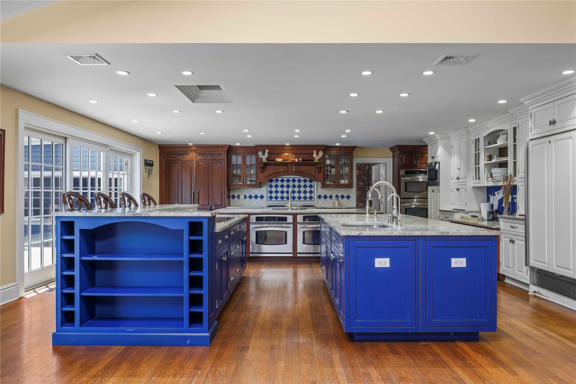 - Kitchen with a large island, a sink, appliances with stainless steel finishes, blue cabinetry, and recessed lighting