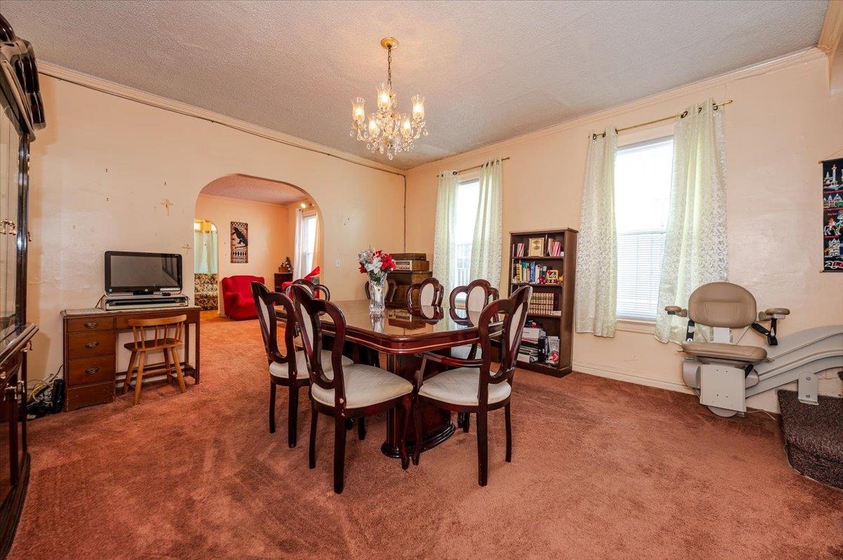 - Dining room featuring a chandelier, carpet flooring, arched walkways, a textured ceiling, and stairs (with functioning stair lift) leading upstairs