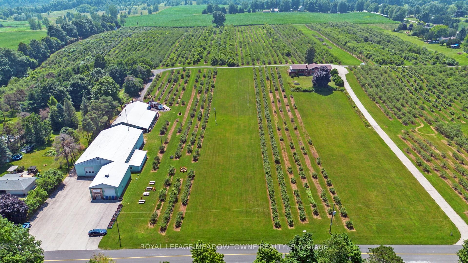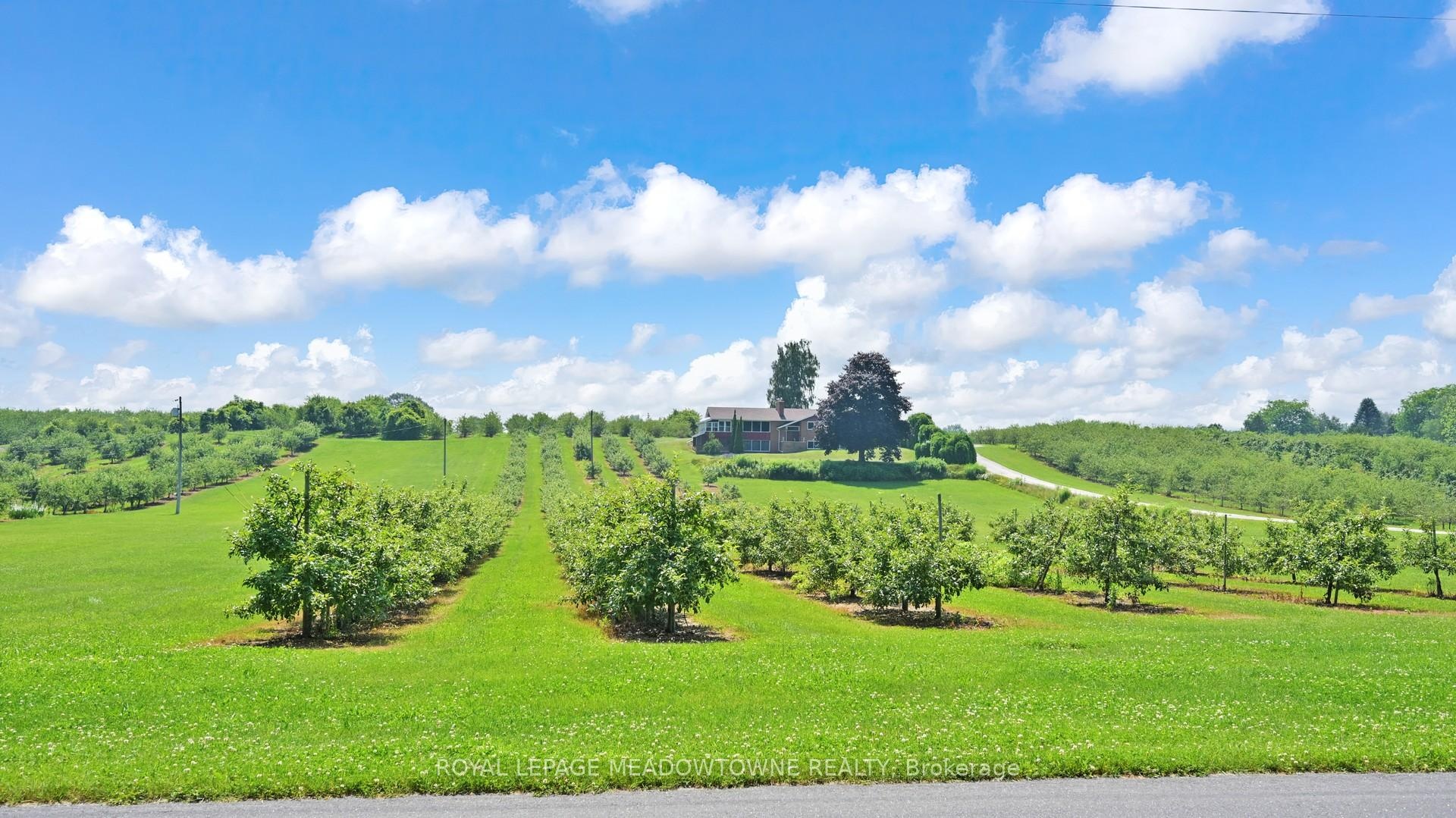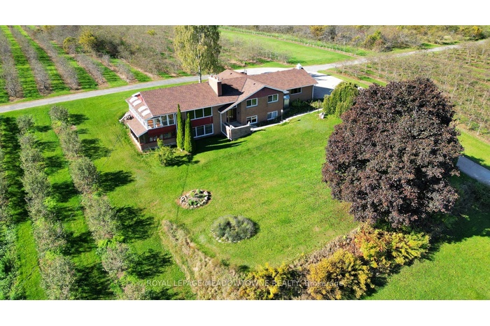This extraordinary countryside estate set on 37.68 gently rolling acres in one of Carlisle's most desirable and emerging rural communities. Located on a quiet paved dead-end road, this Apple Orchard and Licenced Cidery property offers exceptional exposure and access to the vibrant agri-tourism activity of the area. A destination for cyclists, tourists, and day-trippers from Toronto and U.S. border, this scenic setting supports both lifestyle and income-generating uses. 28 +/- acres planted apple orchard with 8+/- acres for vegetables, sunflowers, lavender, hops or other specialty crops. The fully licensed cidery, distillery & retail space, plus a sprawling 3+2 bedroom raised bungalow perched on a hill with panoramic views of the countryside and orchard. Ideal for multigenerational living, staff housing, or as a rental income opportunity, the residence offers 3,700+ SF of finished space. The main level is carpet-free with hardwood and tile flooring, and features a spacious eat-in kitchen with walk-out, formal dining & living rooms with a wood-burning fireplace. The principal includes a private 3-pc ensuite. Updated windows, pot lights, central air, central vacuum, and a forced air furnace (2021) provide modern comfort. The finished basement offers 2 additional bedrooms & bathroom with above-grade windows, an office, and a walkout to an enclosed hot tub room perfect for extended family or guest/farm help accommodation. The attached 2 car garage adds to the convenience, while recent shingles (2023) enhance peace of mind. The fully licensed cidery, distillery, retail & storage with 15-ft ceilings, shipping, washrooms & ample paved parking. The distillery has cold storage plus more insulated, heated space with drive-in doors for a wide range of permitted uses. Bell Fibre, liquor licenses, wholesale & retail network, make this a multi-purpose investment. Live, work and grow all in one place while also having the flexibility to support income or farming-related uses.