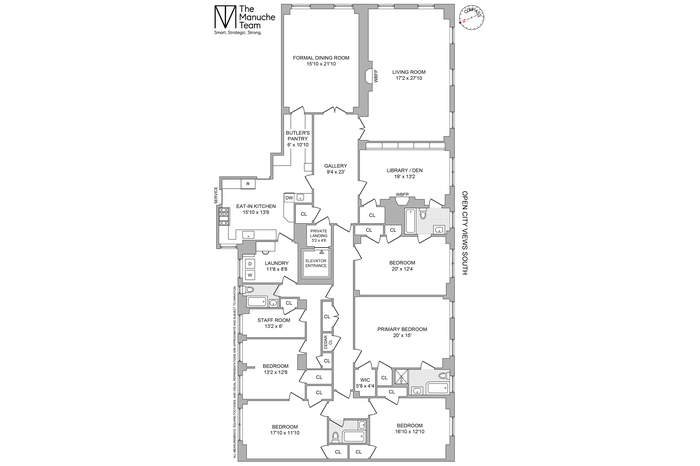 A private elevator vestibule opens onto a grand entrance gallery with high ceilings, beautiful herringbone hardwood floors, and intact original architectural details. Off this center hall, Candela’s signature (sun-flooded) corner living room with five modern oversized windows, a wood-burning fireplace, enjoys unobstructed city views south. Adjacent to the living room is an inviting library (with full bathroom) graciously lined with custom built-ins, and a (second) wood-burning fireplace. A grand formal dining room overlooks Park Avenue, ideal for refined entertaining and formal gatherings. A restored (original) butler’s pantry, complete with custom cabinetry seamlessly connects the dining room to the windowed eat-in kitchen appointed with high-end appliances, including a Viking range, Sub-Zero refrigerator, and dishwasher. The ever important full-sized laundry room is nestled off the kitchen. The private bedroom wing, accessed via a wide hallway, outfitted with a cedar and linen closets, includes four to five spacious bedrooms (as needed) plus separate staff’s bedroom and full bath.