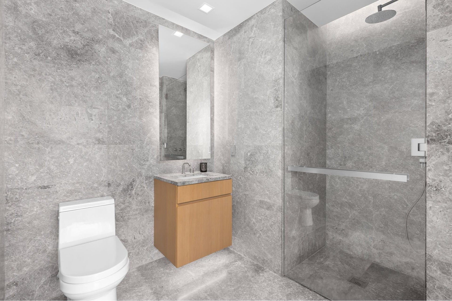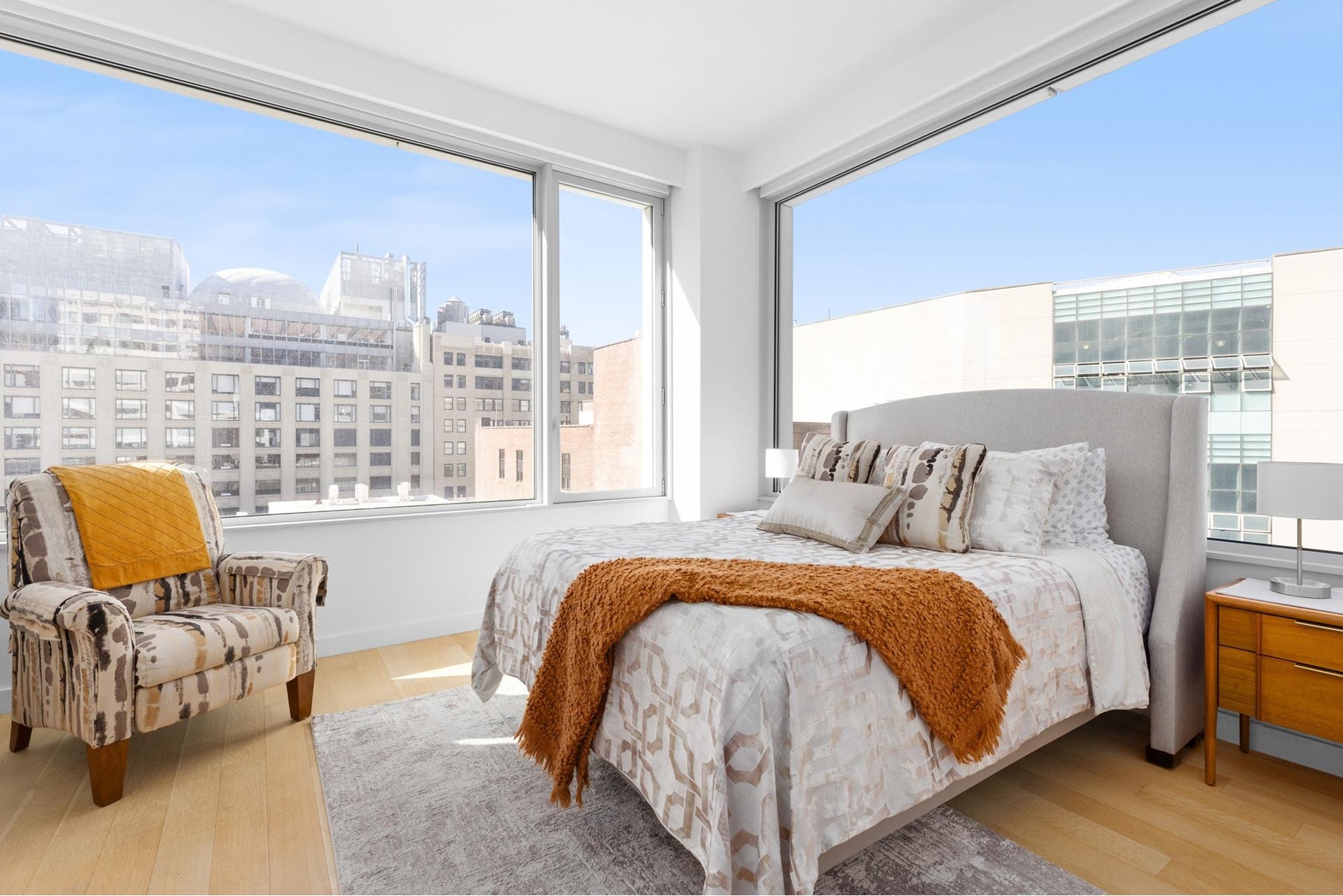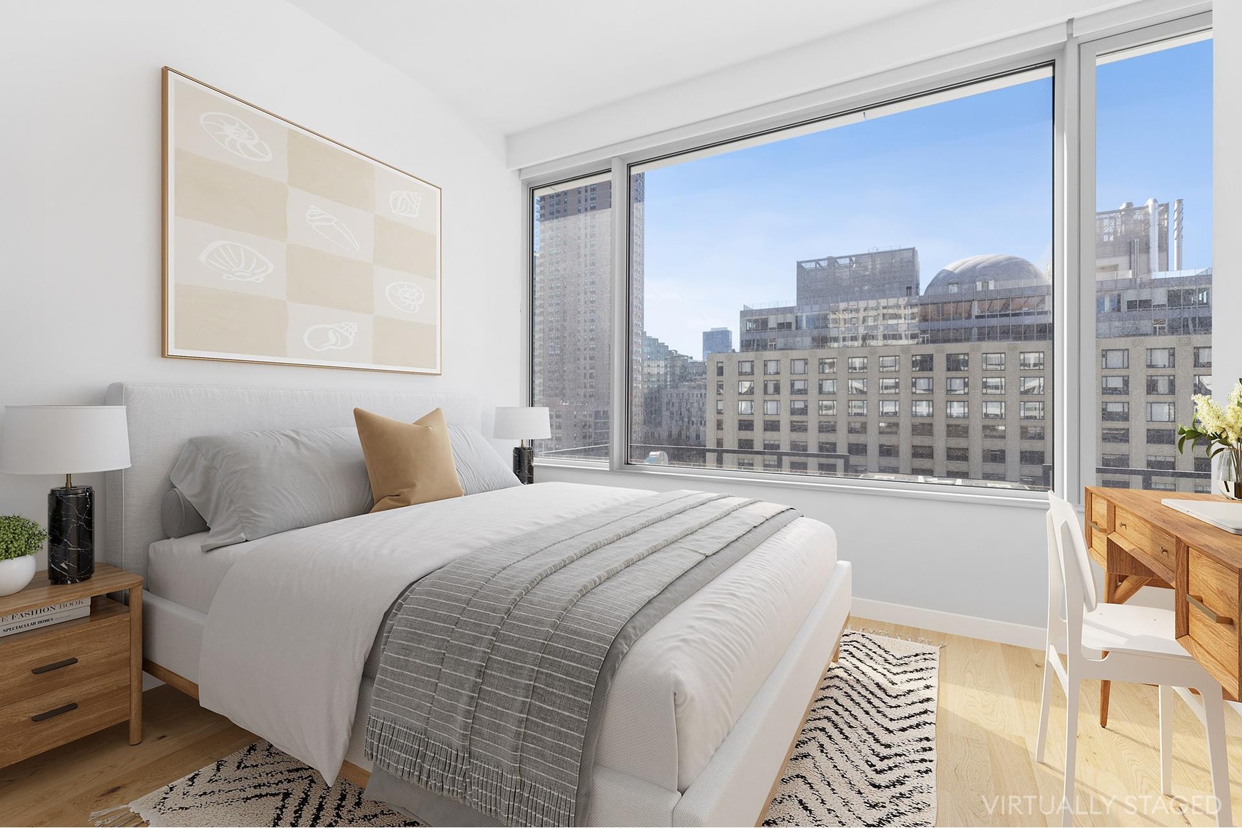 Oversized windows with motorized shades provide ample sunlight and wide-plank oak floors embrace a neutral color palette. The powder room is just off of the entry offers privacy while entertaining. The chef's kitchen features top-of-the-line stainless steel Gaggenau appliances, Italian walnut cabinetry, honed Grigio Nicola marble countertops and slab backsplash. Corner primary bedroom with dual south and west exposure with an en-suite bathroom featuring radiant heated floors, honed tundra gray marble countertop and custom lighting designed by Sheppard. 2nd Bedroom has marble bathroom and south facing views.