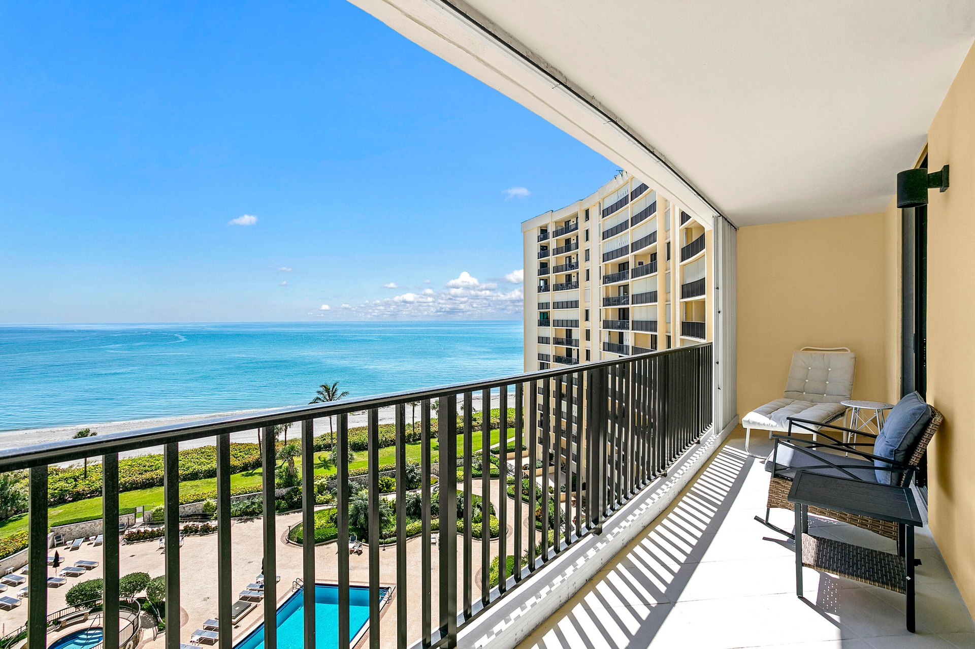Directly on the beach in Jupiter with a stunning 9th floor, due east ocean view.