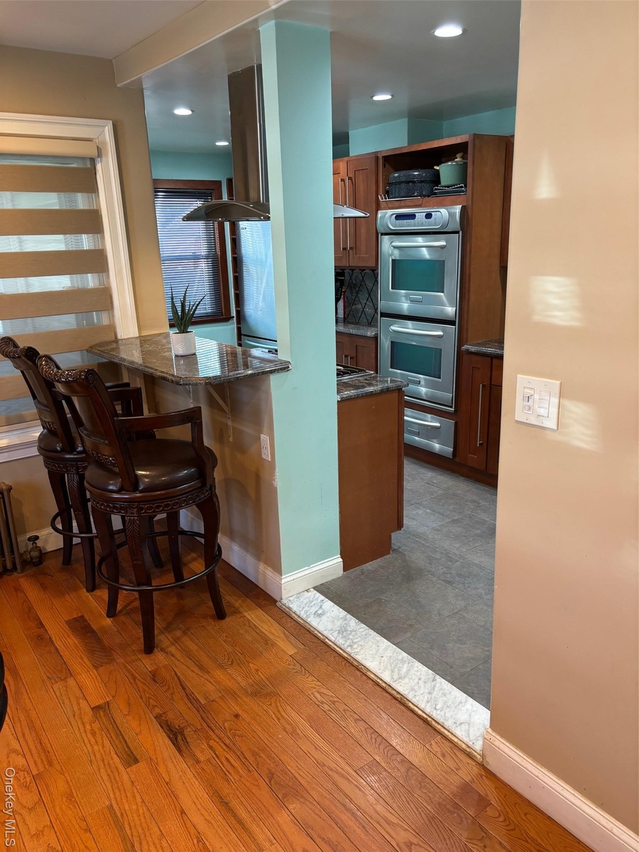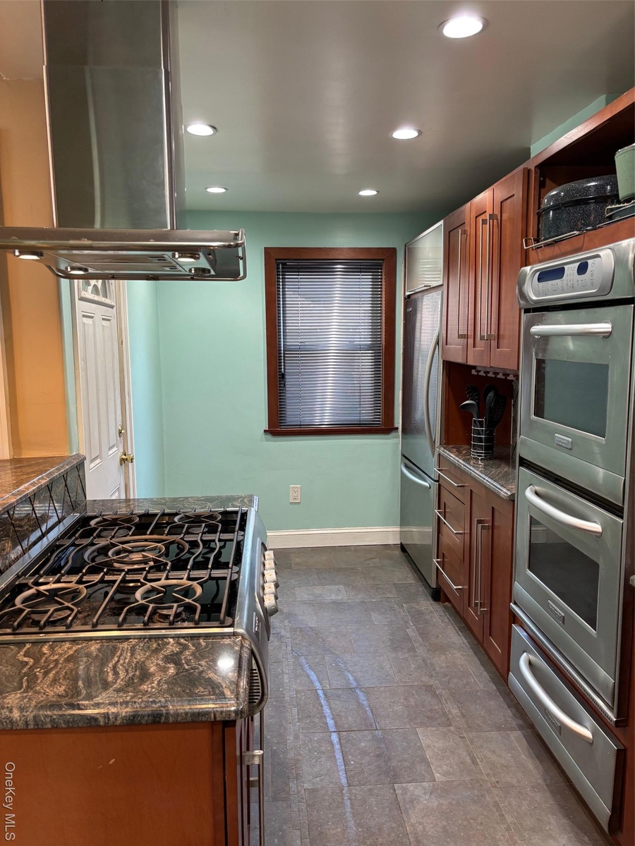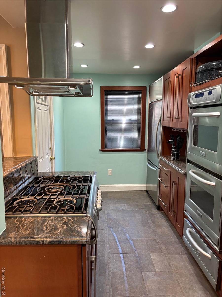 - Kitchen with brown cabinetry, a warming drawer, double oven, dark stone counters, and extractor fan