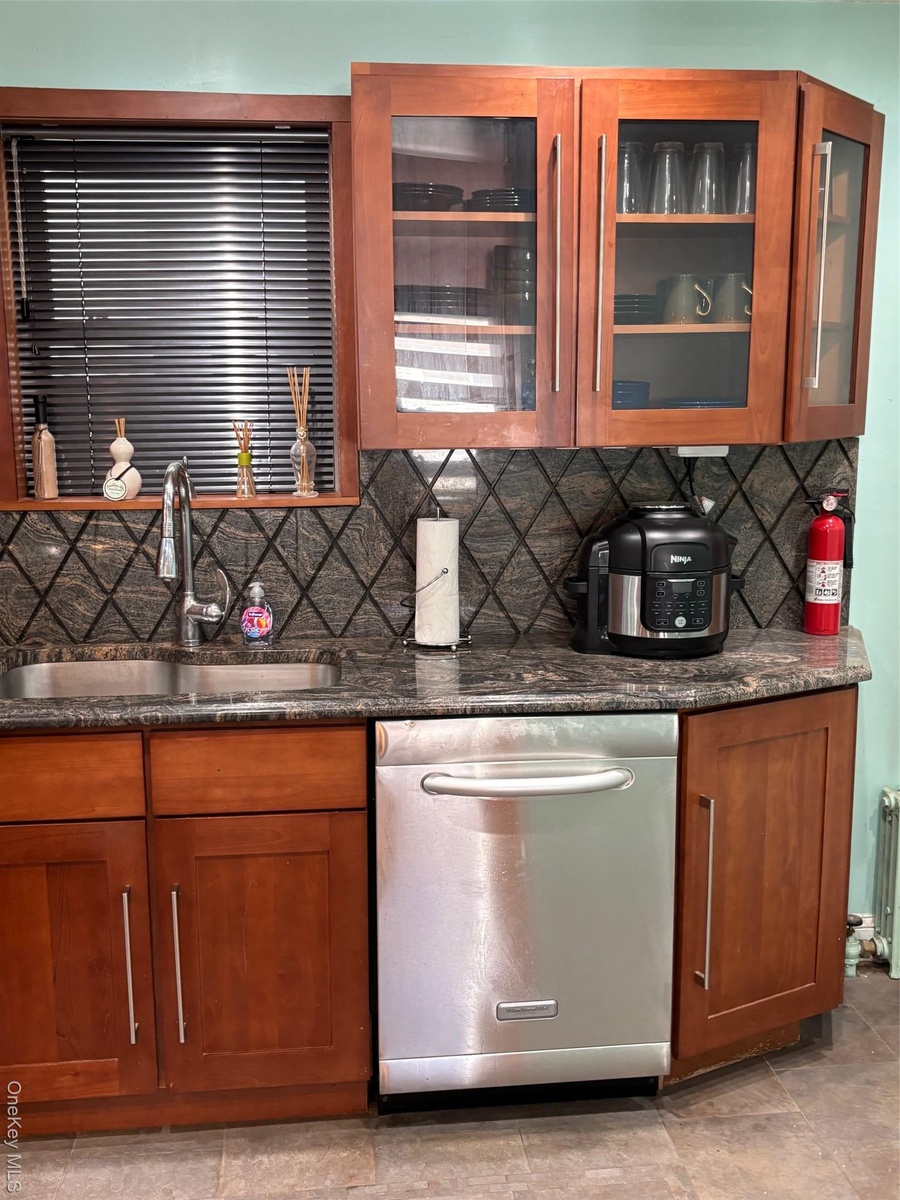 - Kitchen with a sink, dishwasher, brown cabinetry, tasteful backsplash, and glass insert cabinets