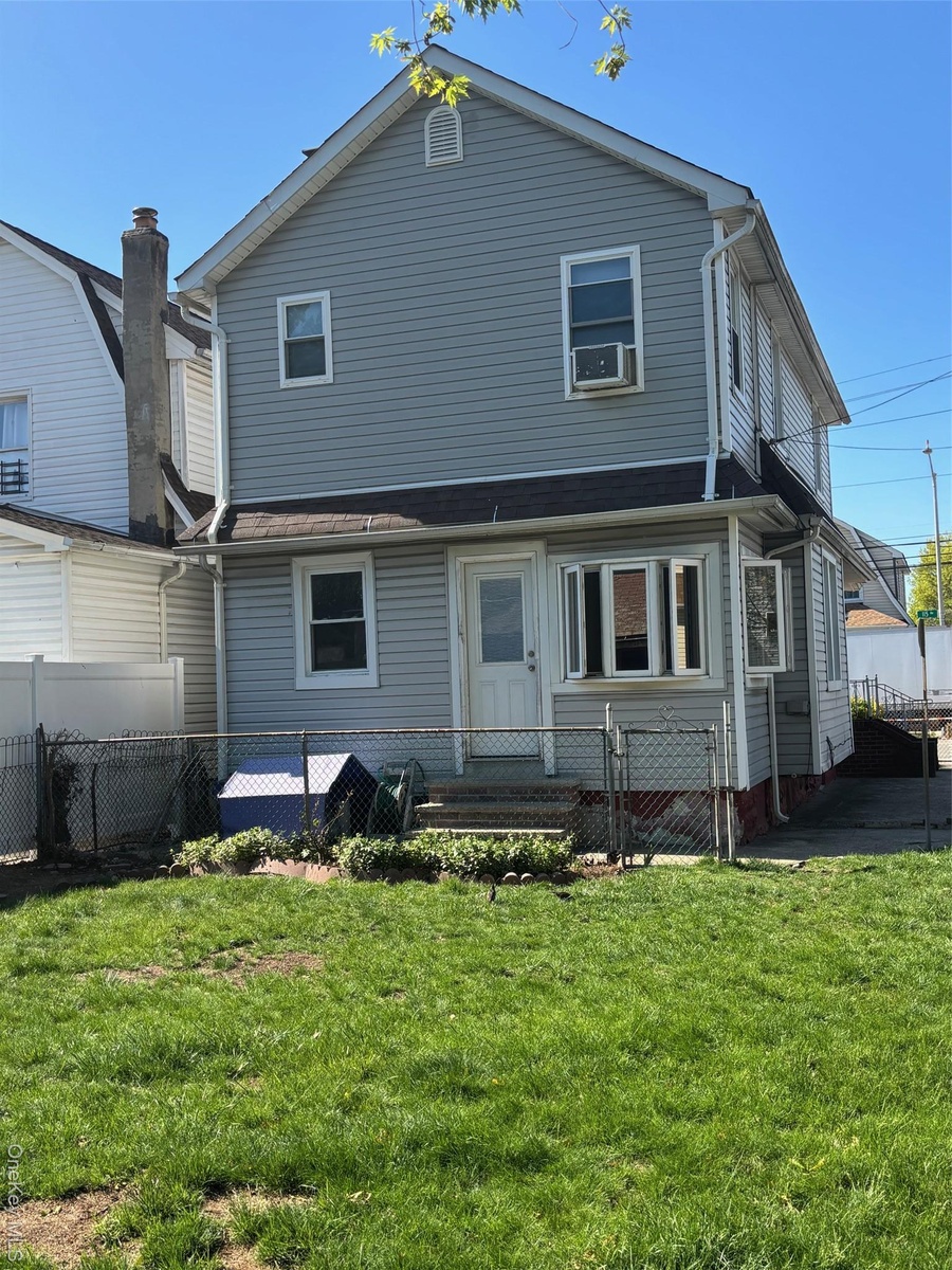 - Rear view of property with a yard, a gate, and a fenced backyard