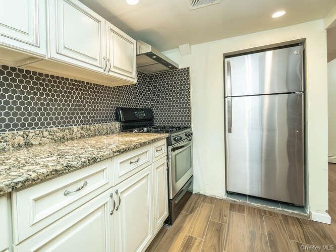 - Kitchen featuring appliances with stainless steel finishes, wall chimney exhaust hood, backsplash, light stone countertops, and dark wood-style floori
