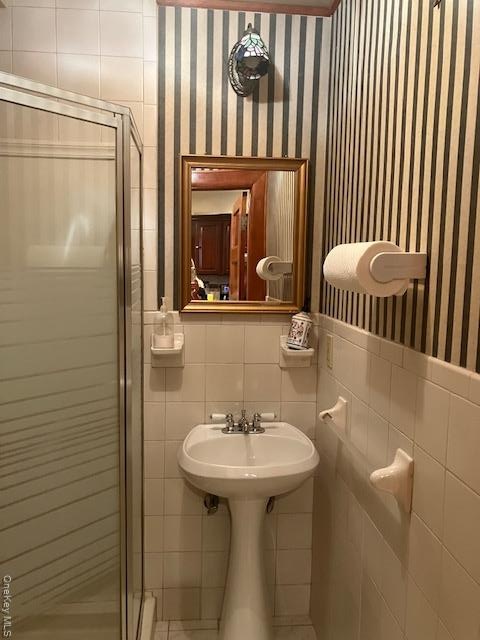 - Bathroom with tile walls, wallpapered walls, and a shower stall