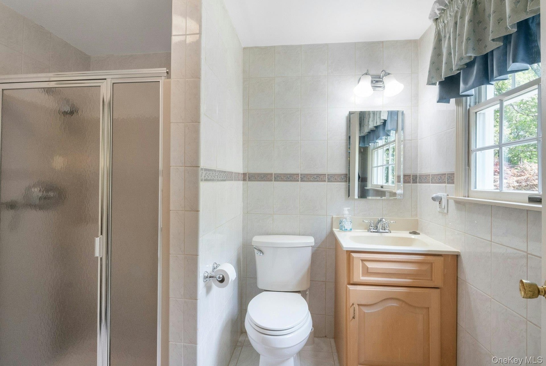 - Full bathroom with tile walls, toilet, a bidet, tile patterned flooring, and tiled shower