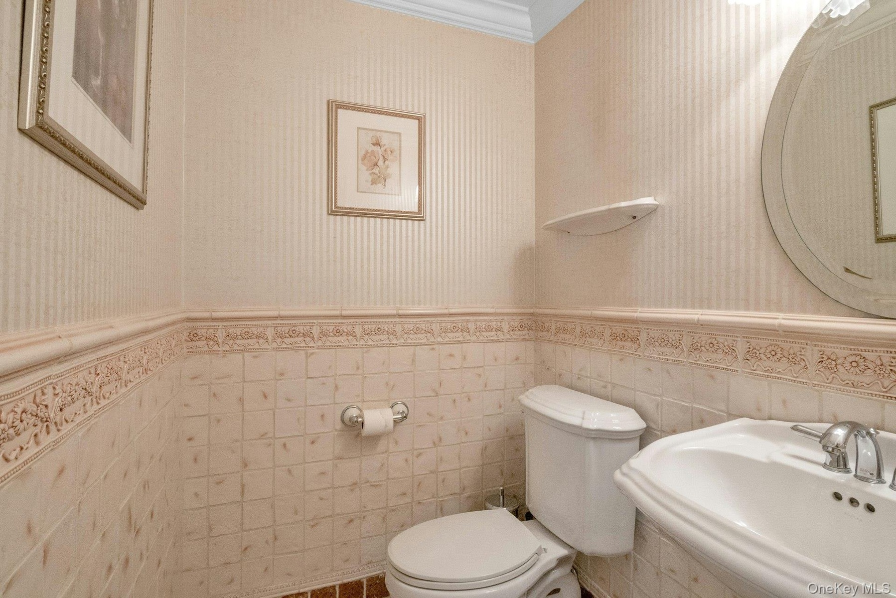 - Living area with bar with sink, a fireplace, crown molding, light tile patterned flooring, and baseboards