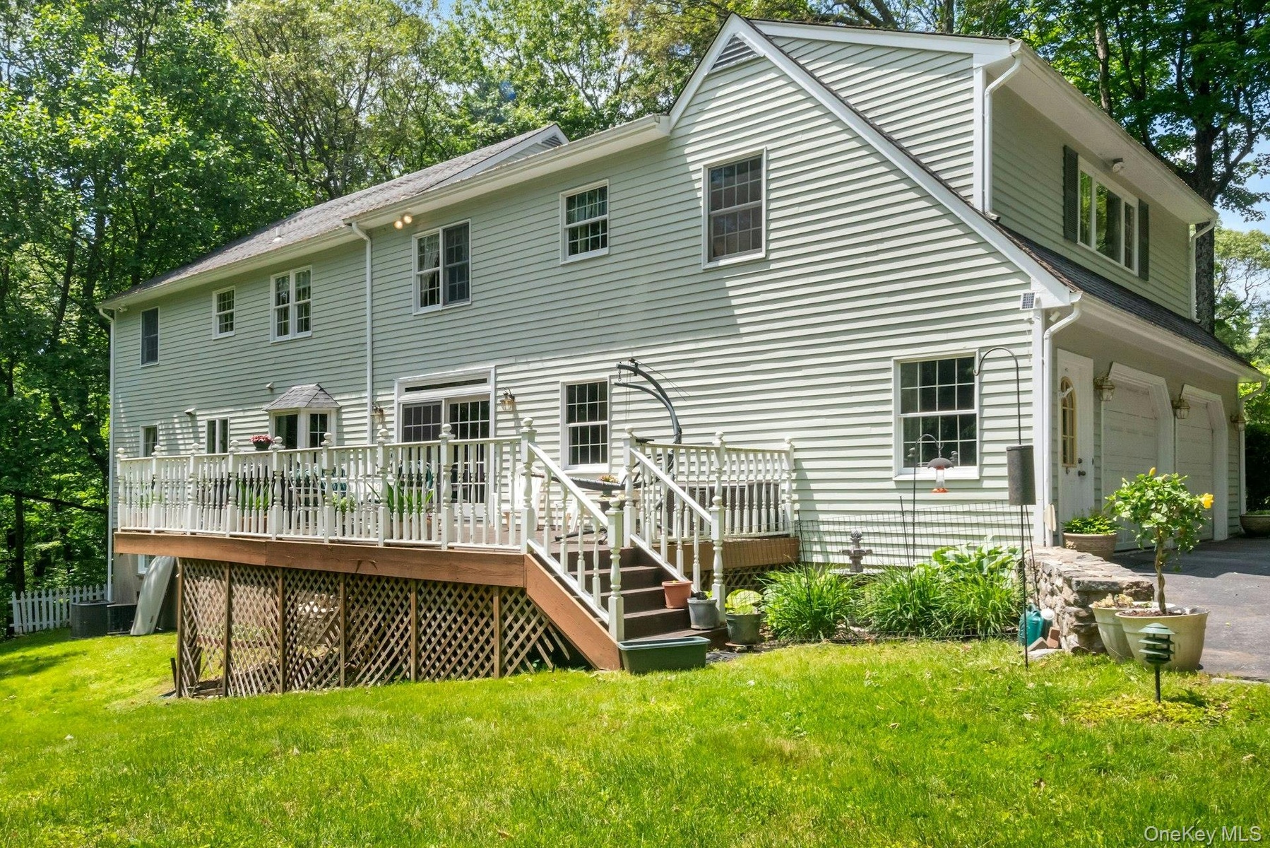 - Rear view of house with a lawn, an attached garage, a wooden deck, and driveway