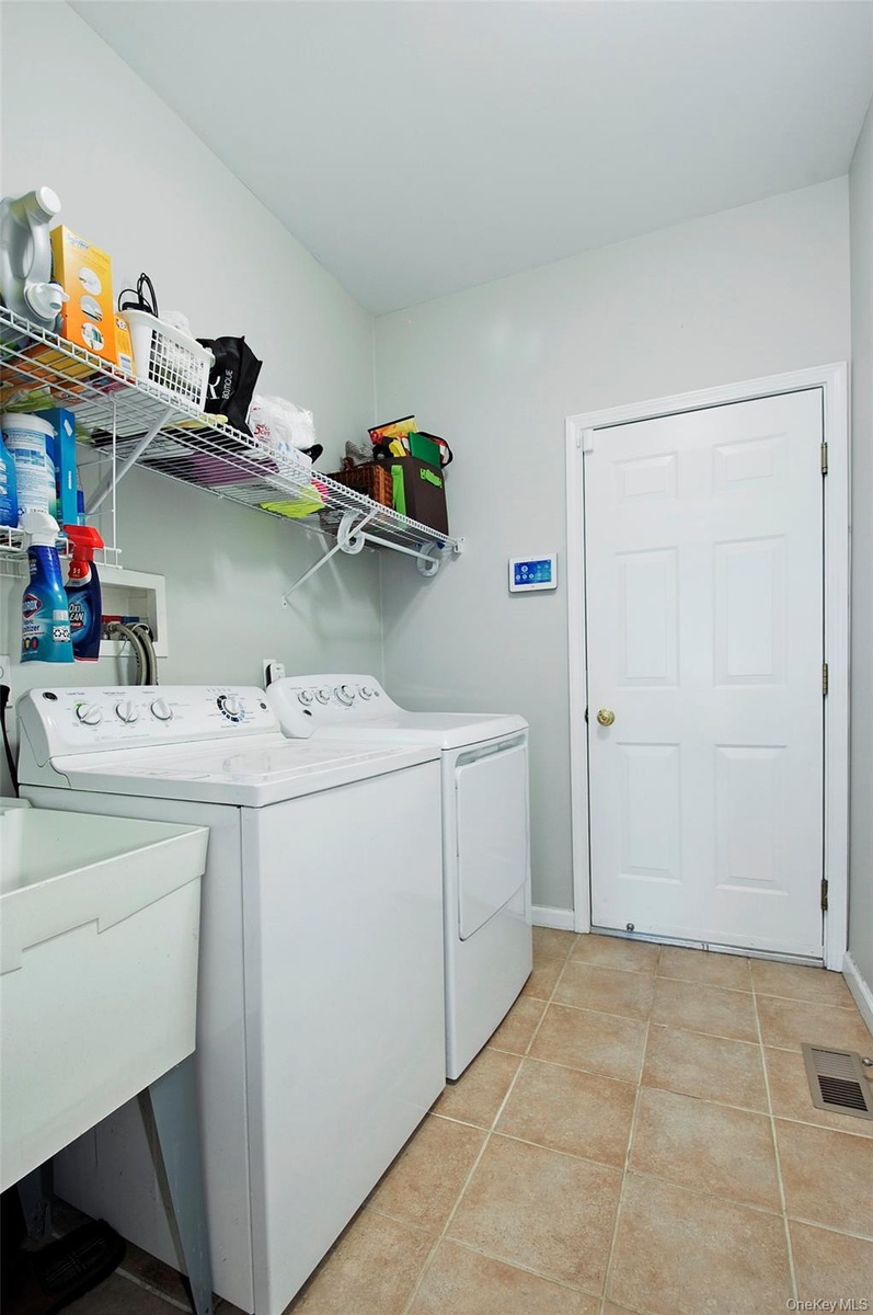 - Laundry room featuring washing machine and clothes dryer and light tile patterned flooring