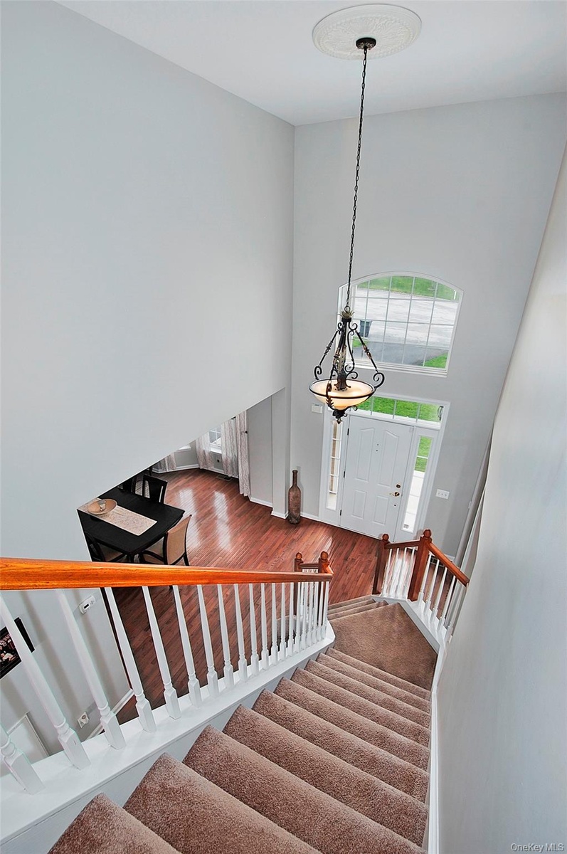 - Entrance foyer featuring a towering ceiling, stairway, french doors, and wood finished floors