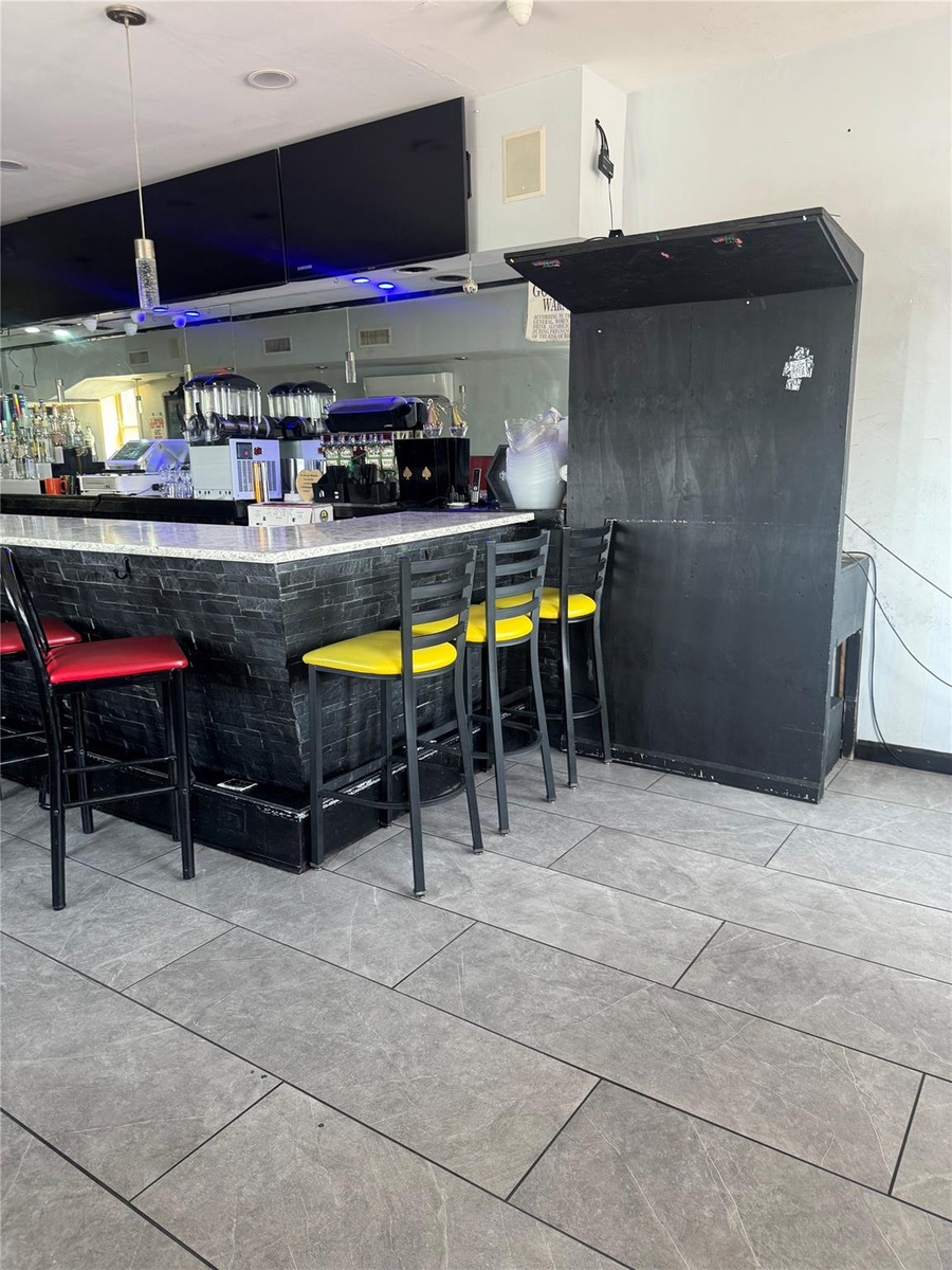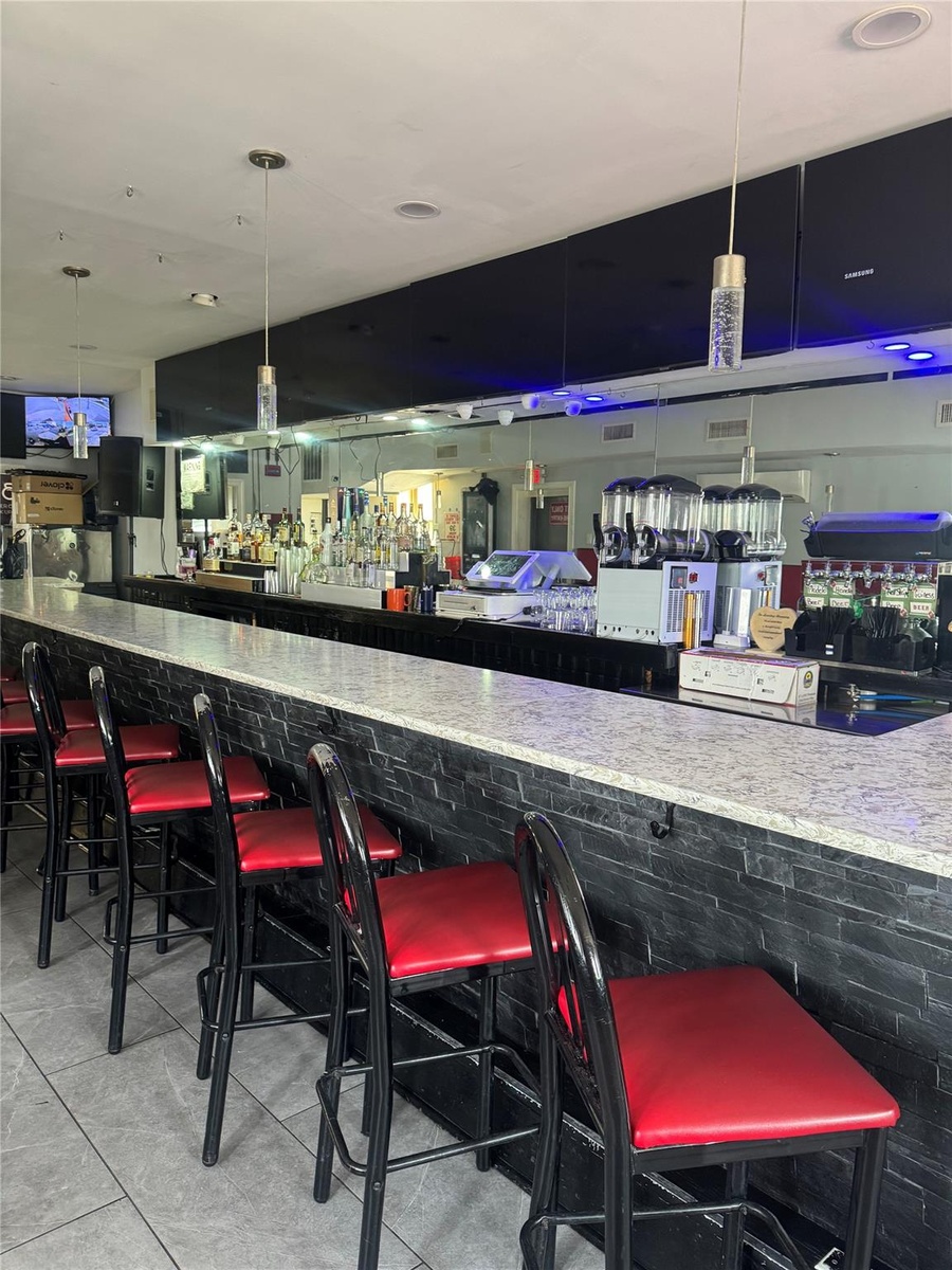 - Indoor dry bar with tile patterned flooring and hanging light fixtures